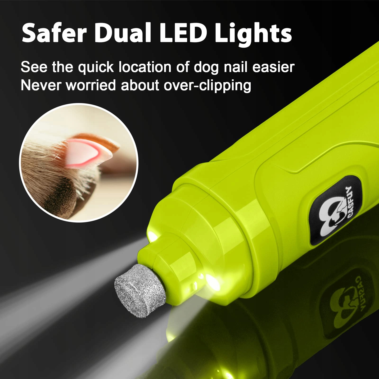 Ulepszony trymer do pazurów dla psów z 2 lampkami LED: Elektryczna szlifierka do pazurów Casfuy posiada 2 lampki LED, które pozwalają lepiej zobaczyć położenie naczyń krwionośnych w pazurze. Unikaj nadmiernego szlifowania i nie rani swoich futrzanych przyjaciół. Dwa lampki LED to nowy projekt, lampki świecą dokładniej niż w innych zwykłych szlifierkach LED.