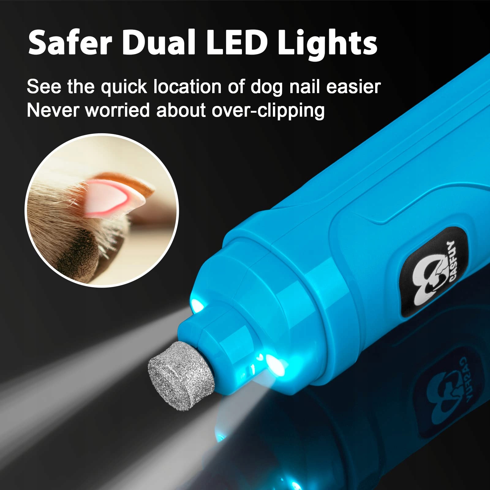 Ulepszony trymer do pazurów dla psów z 2 lampkami LED: Elektryczna szlifierka do pazurów Casfuy posiada 2 lampki LED, które pozwalają lepiej zobaczyć położenie naczyń krwionośnych w pazurze. Unikaj nadmiernego szlifowania i nie rani swoich futrzanych przyjaciół. Dwa światła LED to nowy projekt, światła świecą dokładniej niż w innych zwykłych szlifierkach LED.