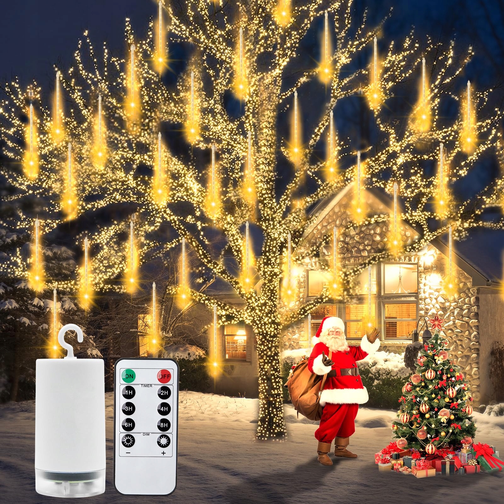 CCILAND Łańcuch świetlny z deszczem meteorytów na baterie, 30CM 8 rur 192 LED oświetlenie świąteczne na zewnątrz z timerem, wodoodporne spadające światła deszczu na Boże Narodzenie, choinkę, ślub, okap, ogród (ciepła biel)