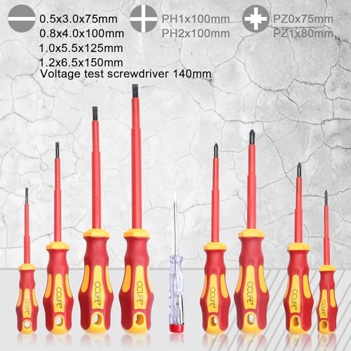 Kompletny zestaw izolowanych wkrętaków: Zestaw zawiera wkrętaki w różnych rozmiarach (SL3 x 75mm, SL4 x 100mm, SL5.5 x 125mm, SL6.5 x 150mm, PH1 x 100mm, PH2 x 100mm, PZ0 x 75mm, PZ1 x 80mm) oraz miernik napięcia. Wszechstronny zestaw do wszystkich prac elektrycznych.