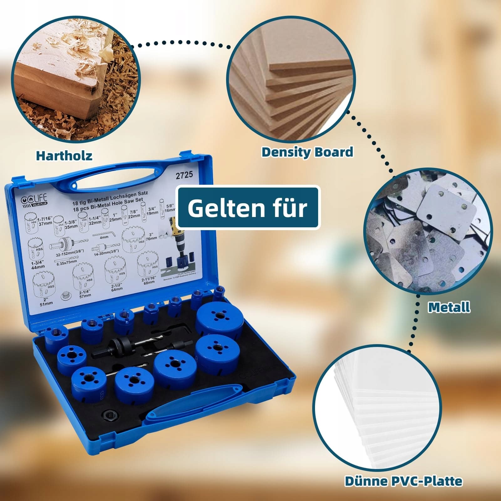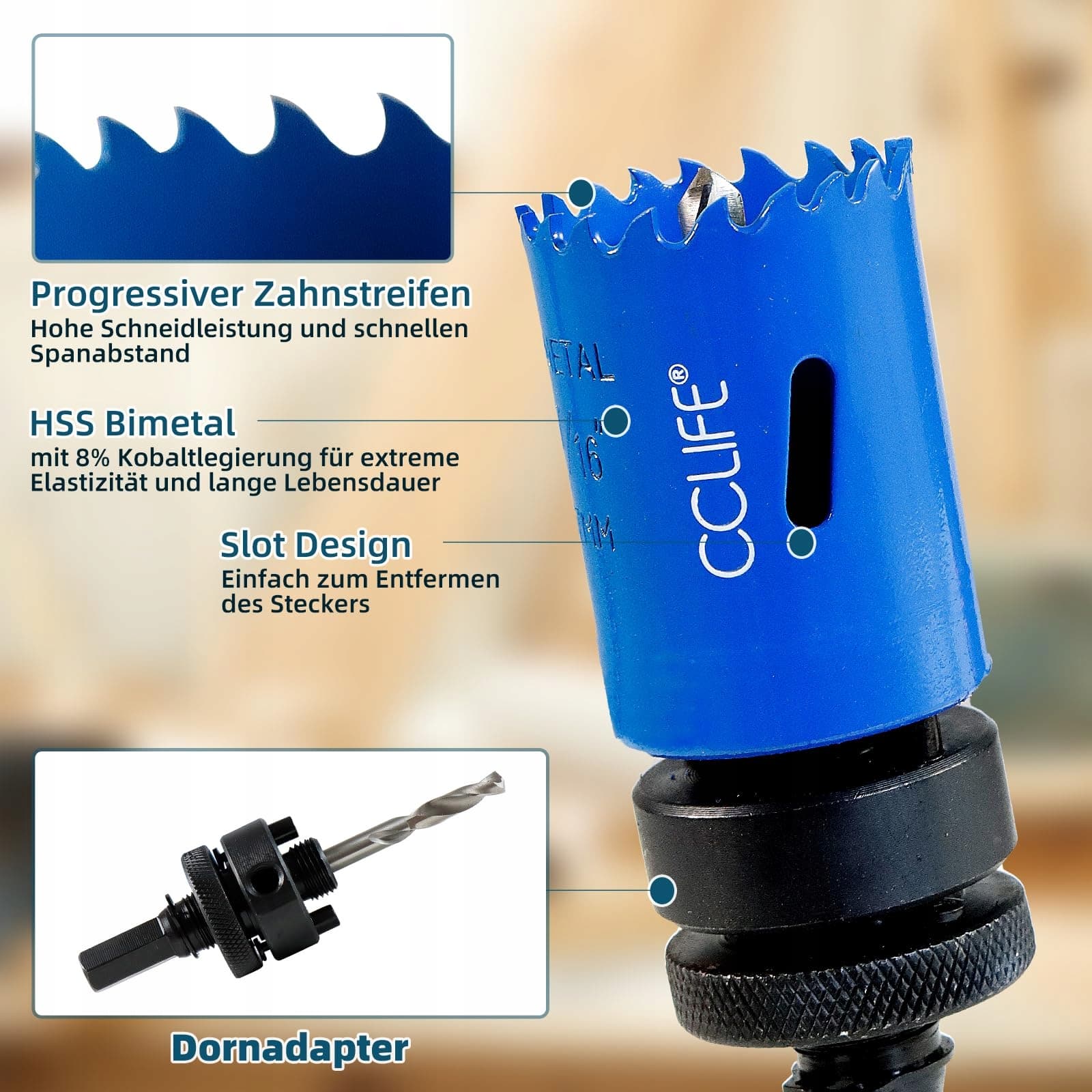 CCLIFE Zestaw wierteł koronowych Bi-Metal, 18-częściowy wiertło koronowe M3 HSS-CO Ø16-76mm | Głębokość cięcia 38mm | do wiercenia stali nierdzewnej, metali lekkich, drewna, PVC, plastiku itp.