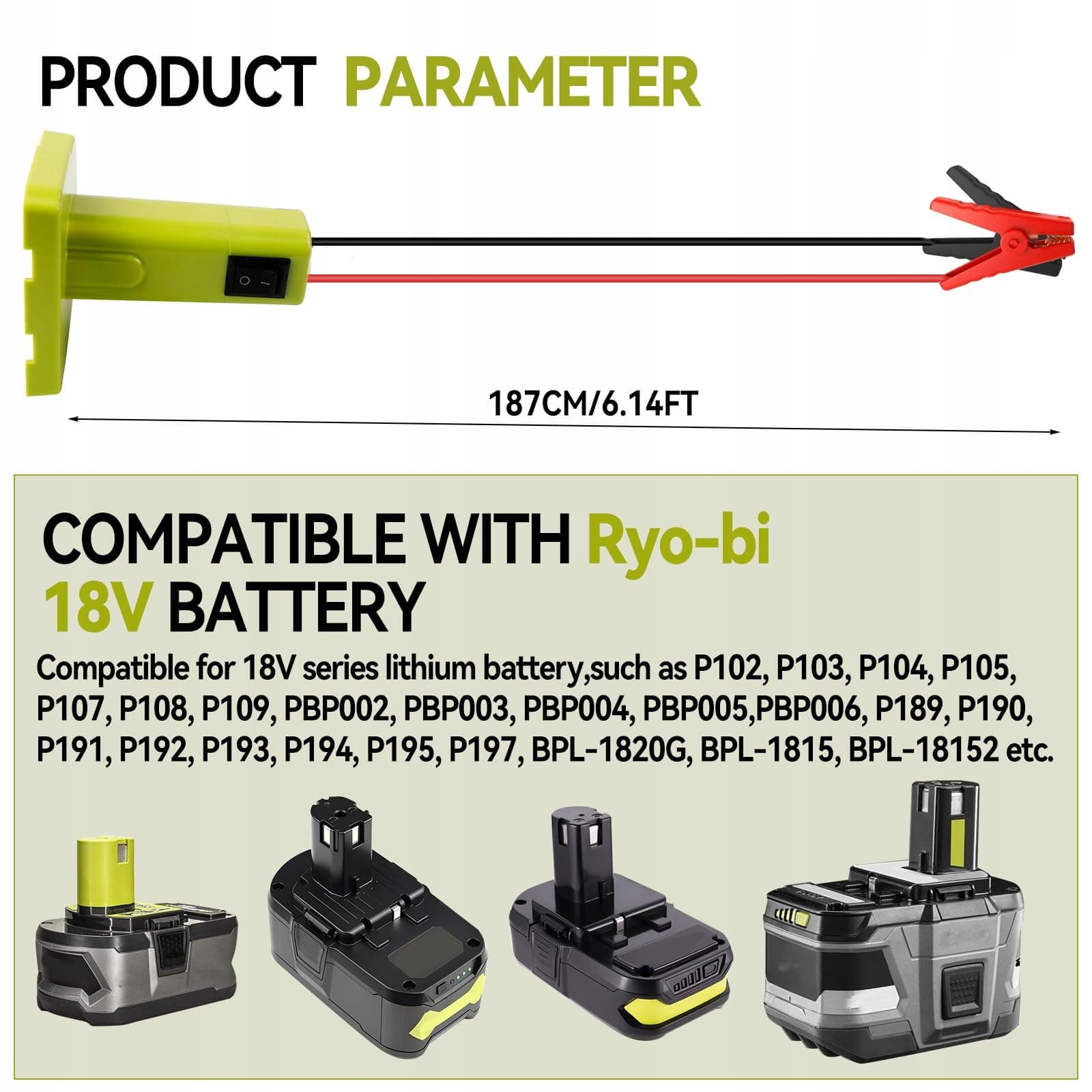 【Kompatybilny z akumulatorem Ryobi 18V】 Adapter kabla rozruchowego do samochodu jest kompatybilny z akumulatorami Ryobi 18V, takimi jak P100 P102 P103 P104 P105 P107 P108 P109 i innymi. Tylko narzędzie, akumulator nie jest w zestawie