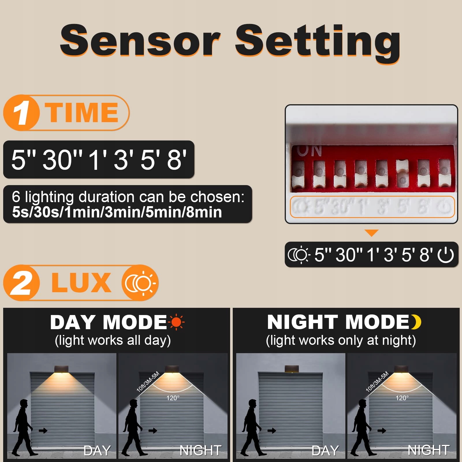【Ulepszony czujnik ruchu】- W przeciwieństwie do tradycyjnych lamp zewnętrznych, czujniki w oświetleniu zewnętrznym CELAVY można regulować. 1. Czas wyłączenia lampy zewnętrznej można ustawić od 5 sekund do 8 minut. 2. Oświetlenie ścienne można ustawić tak, aby działało tylko w nocy lub zarówno w dzień, jak i w nocy. 3. Tryb indukcji można wyłączyć.