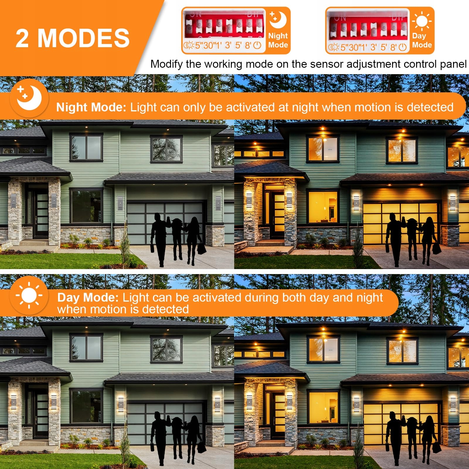 【Regulowany czujnik ruchu】: Nasza lampa z czujnikiem ruchu na zewnątrz oferuje elastyczne ustawienia czujnika, które wyróżniają ją spośród innych modeli. Możesz łatwo przełączać się między trybem dziennym a nocnym oraz dostosować czas wyłączania według własnych potrzeb. W razie potrzeby możesz również przełączyć lampę z czujnikiem ruchu na tryb normalny, aby ręcznie kontrolować oświetlenie.