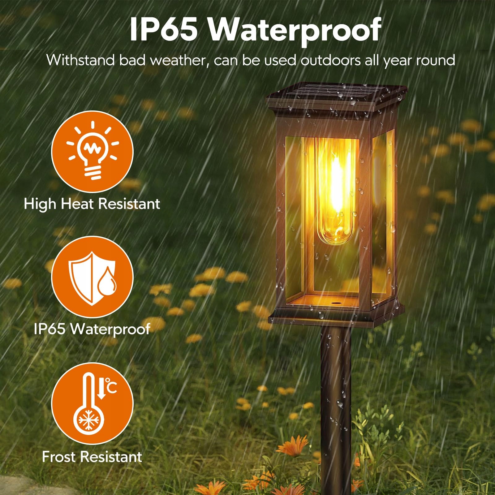 Wodoodporna lampa solarna IP65: Wodoodporność klasy IP65 do użytku na zewnątrz pozwala na ciągłą pracę w różnych warunkach pogodowych, bez obaw o deszcz, śnieg i mróz. Wodoodporne lampy solarne do ogrodu są szczególnie odpowiednie do ogrodu, balkonu i kempingu na zewnątrz.