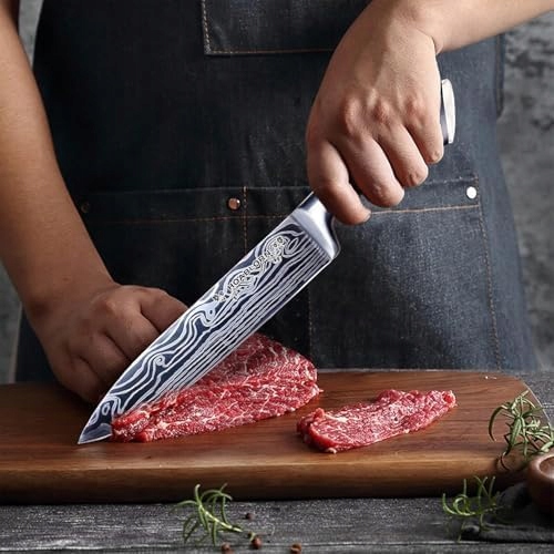 【Zaskakujący prezent】 Połączenie klasycznego wyglądu z laserowym wzorem damasceńskim w pięknym pudełku to wyrafinowany i wysokiej jakości prezent, a profesjonalne noże mogą spełnić Twoje potrzeby krojenia w kuchni.