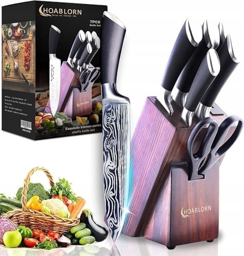 ChefHoablorn 7-częściowy zestaw noży z blokiem drewnianym, samonabijający się do zestawu noży kuchennych, zestaw noży ze stali nierdzewnej, profesjonalny zestaw noży kuchennych, dobry do domu, dla kucharza, na ślub, prezent na wprowadzkę