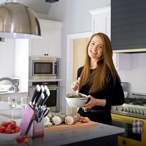 【Zestaw noży ze stali nierdzewnej】 Profesjonalny zestaw noży z blokiem wykonany jest z niemieckiej stali węglowej X50Cr15, która jest ostra i odporna na rdzę, trwała, stabilna i elastyczna. Może łatwo pomóc Ci w codziennej pracy w kuchni.
