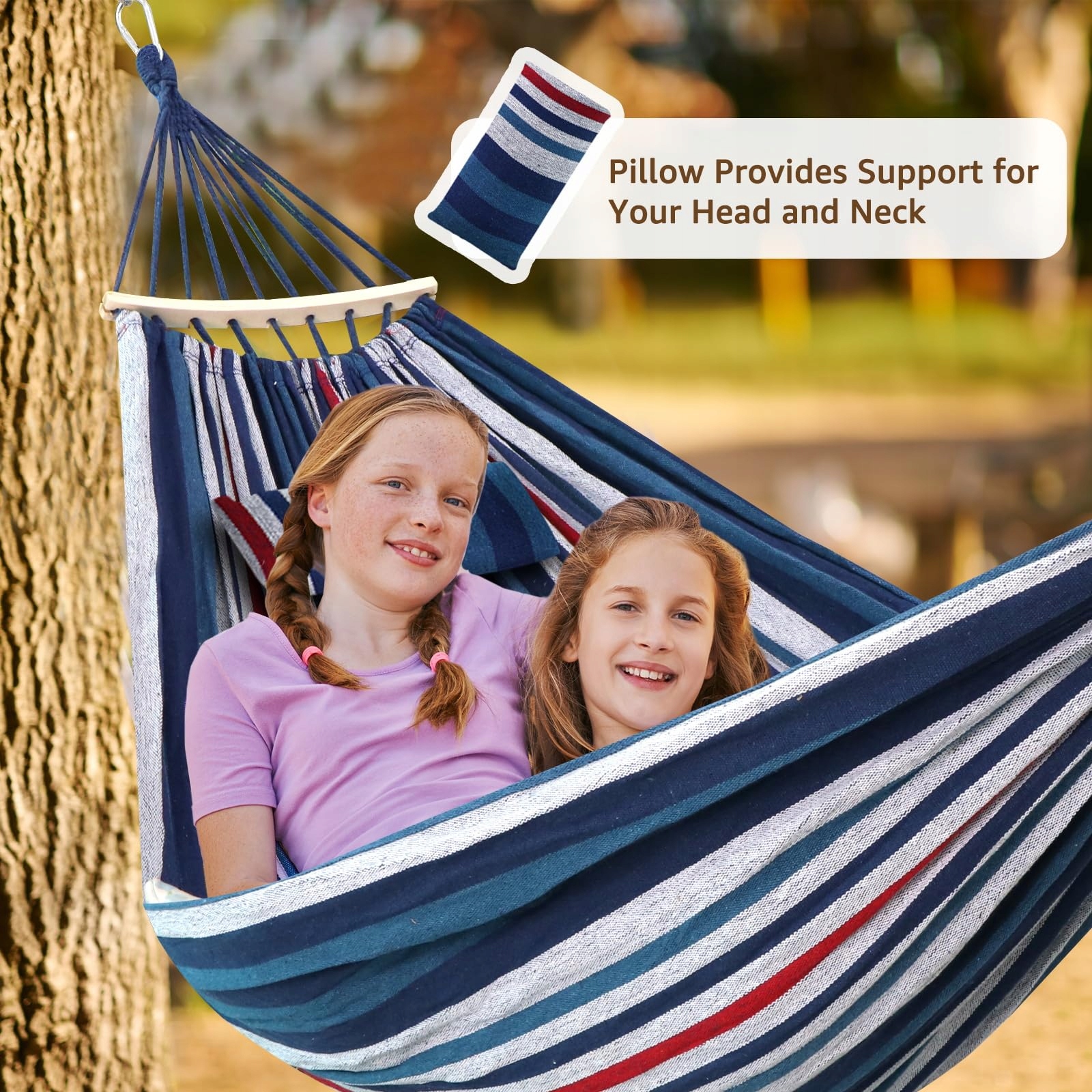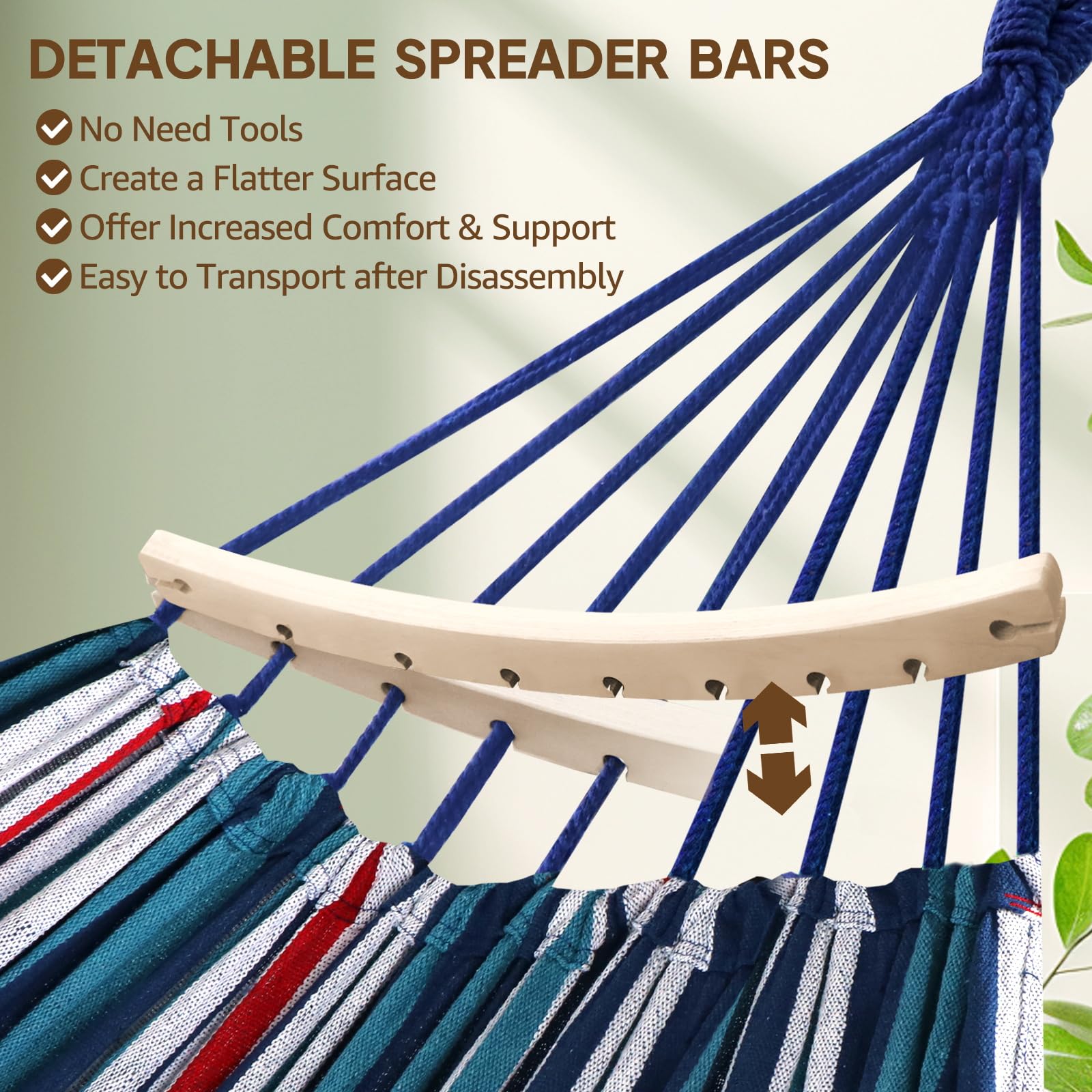 Stabilność i bezpieczeństwo: Drążki rozporowe poprawiają stabilność i zapobiegają nadmiernemu kołysaniu lub przechylaniu, zapewniając bezpieczne i chronione doświadczenie podczas wchodzenia lub wychodzenia z hamaka. Dzięki dołączonym dwóm bezstopniowo regulowanym paskom i dwóm karabińczykom, możesz łatwo i bezpiecznie zamontować hamak, promując bezpieczne i przyjemne leniuchowanie. Karabińczyki zapewniają niezawodne i bezpieczne punkty mocowania.