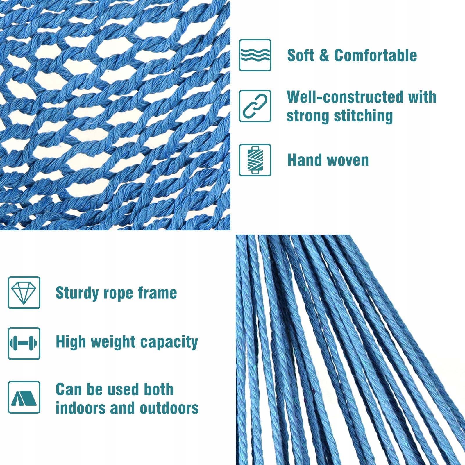 Spokój i relaks: Swobodnie płynąca tkanina hamaka idealnie dopasowuje się do ciała, zapewniając przyjemne, bezwładne zawieszenie. Ich luźny, przewiewny design utrzymuje chłód nawet w gorące dni i jest ręcznie tkany z grubego bawełnianego włókna. To prosty i nieskomplikowany fotel hamakowy z siatki, który jest zarówno wygodny, jak i oddychający. Siatkowy design zapewnia optymalną oddychalność, która utrzymuje ciało w chłodzie i suchości.