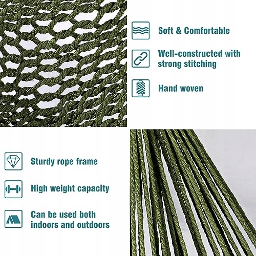 Spokój i relaks: Swobodnie płynąca tkanina hamaka idealnie dopasowuje się do ciała, zapewniając przyjemne, bezwładne zawieszenie. Ich luźny, przewiewny design utrzymuje chłód nawet w gorące dni i jest ręcznie tkany z grubego bawełnianego sznurka. To prosty i nieskomplikowany fotel hamakowy z siatki, który jest zarówno wygodny, jak i oddychający. Siatkowy design zapewnia optymalną oddychalność, która utrzymuje ciało w chłodzie i suchości.