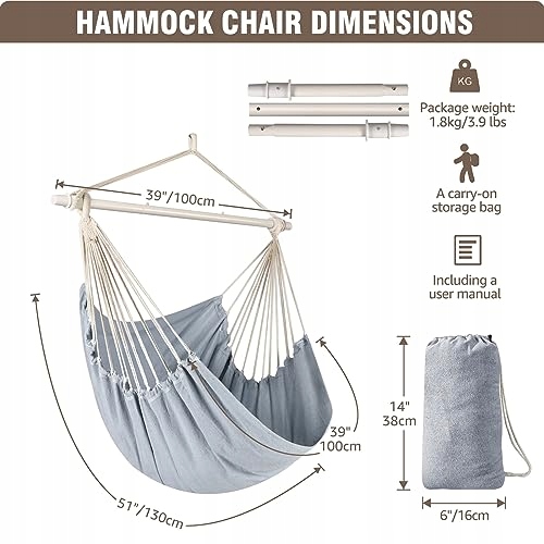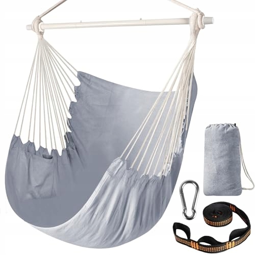 Trwałość i bezpieczeństwo. Solidna konstrukcja i wzmocnione szwy zapewniają długą żywotność foteli, które mogą udźwignąć do 227 kg. Możesz być pewien, że te fotele utrzymają Twoją wagę i zapewnią bezpieczne i niezawodne miejsce do siedzenia. Wysokiej jakości mieszanka bawełny jest również odporna na zużycie, co sprawia, że Twój fotel wiszący pozostanie w doskonałym stanie nawet przy częstym użytkowaniu.
