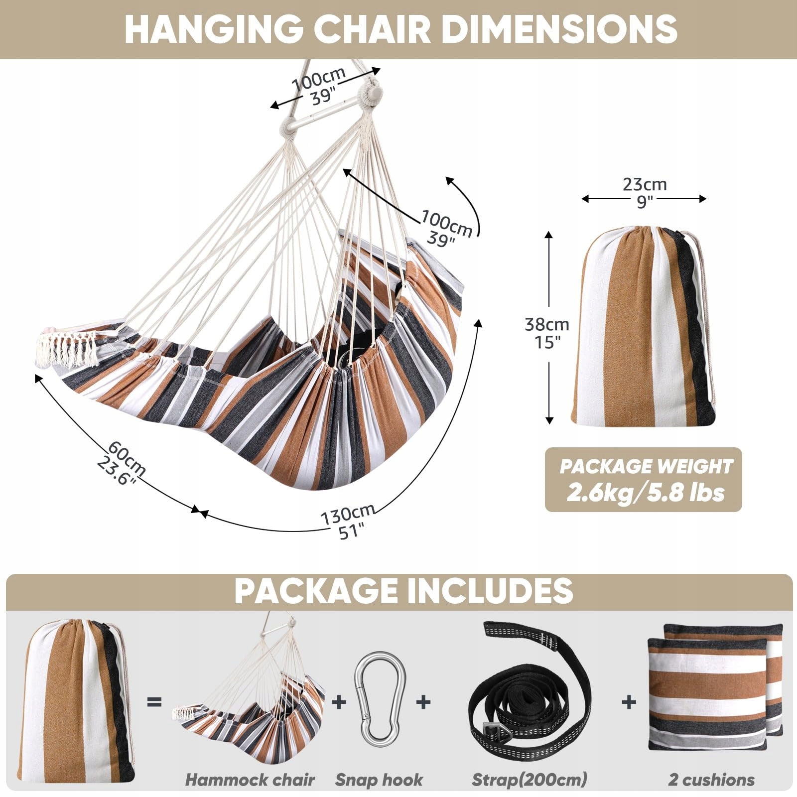 Zawieszenie: Może być płynnie regulowane i wytrzymuje do 227 kg, oferując jasne instrukcje, jak bezpiecznie je zawiesić, jest wystarczająco mocne, aby utrzymać ciężar użytkownika. To specjalne zawieszenie może pomóc w łatwiejszym zawieszeniu krzesła hamakowego na gałęzi drzewa, belce sufitowej lub stojaku na krzesło hamakowe.