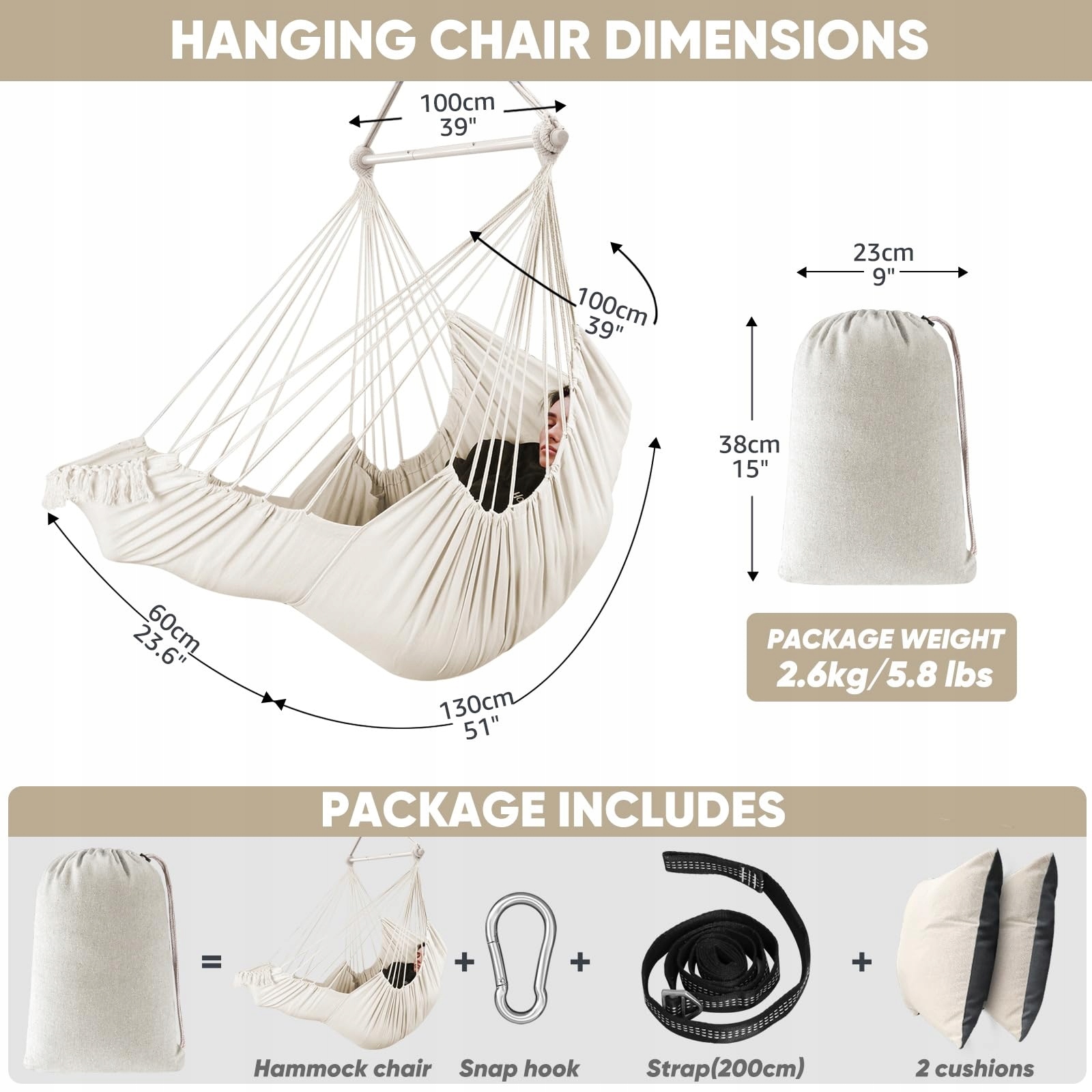 Zawieszenie wiszące: Może być płynnie regulowane i wytrzymuje do 227 kg, oferując jasne instrukcje, jak bezpiecznie je zawiesić, jest wystarczająco mocne, aby utrzymać ciężar użytkownika. To specjalne zawieszenie wiszące może pomóc w łatwiejszym zawieszeniu krzesła hamakowego na gałęzi drzewa, belce sufitowej lub stojaku na krzesło hamakowe.