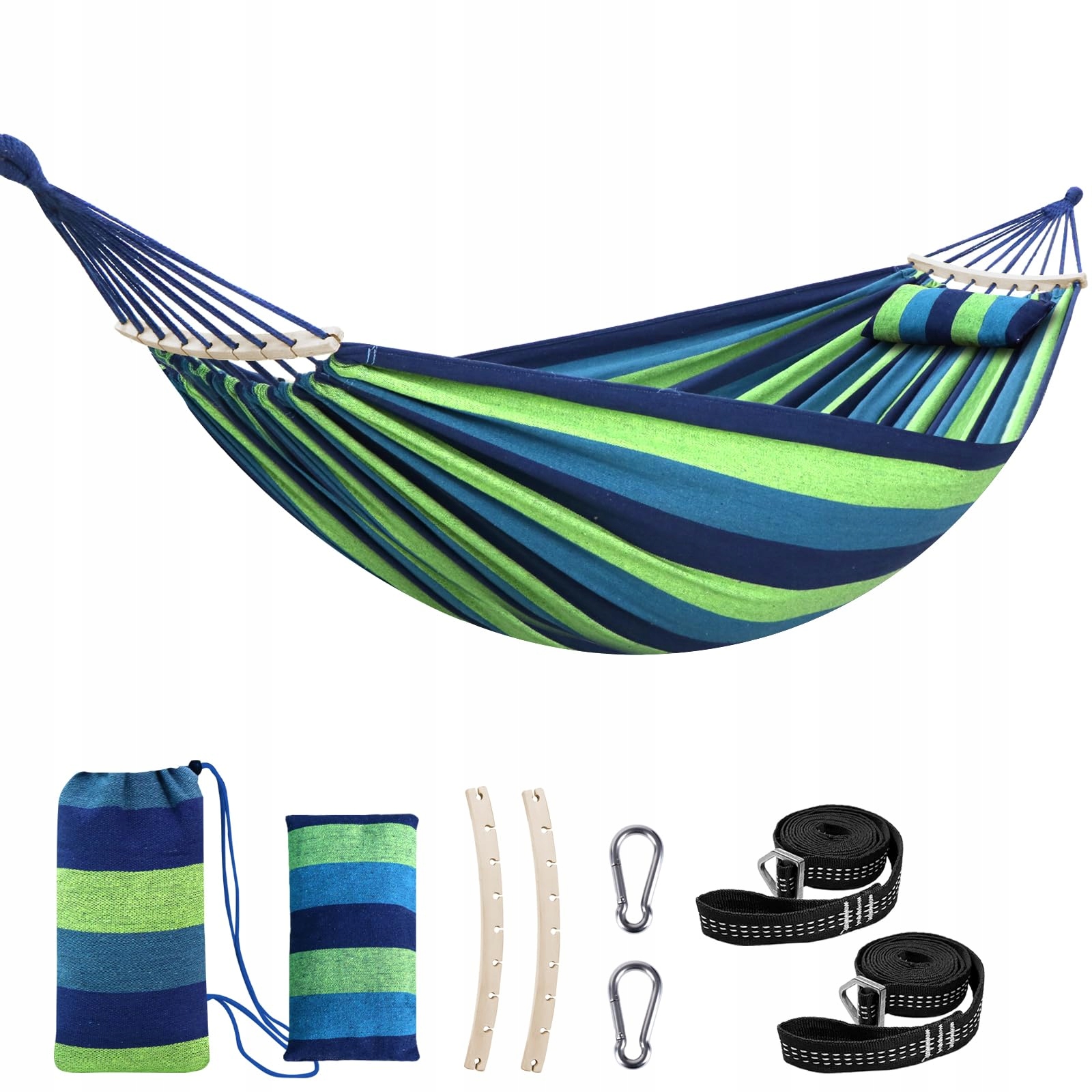 CHIHEE Hamak Bawełniany Duży Miękki Oddychający Campingowy Do 300kg Przenośny Zdejmowany Drążek Poduszka 2 Mocne Pasy 2 Karabińczyki