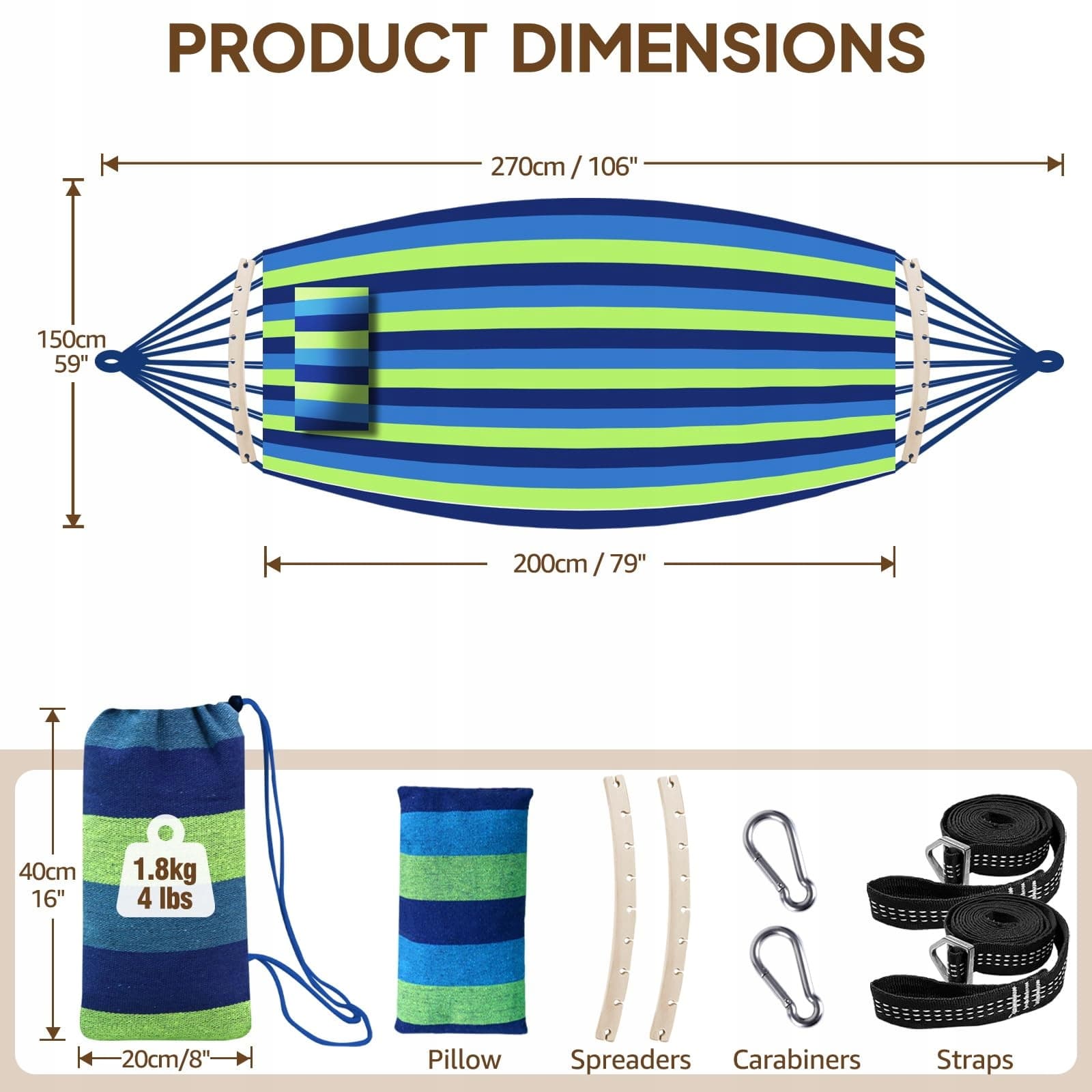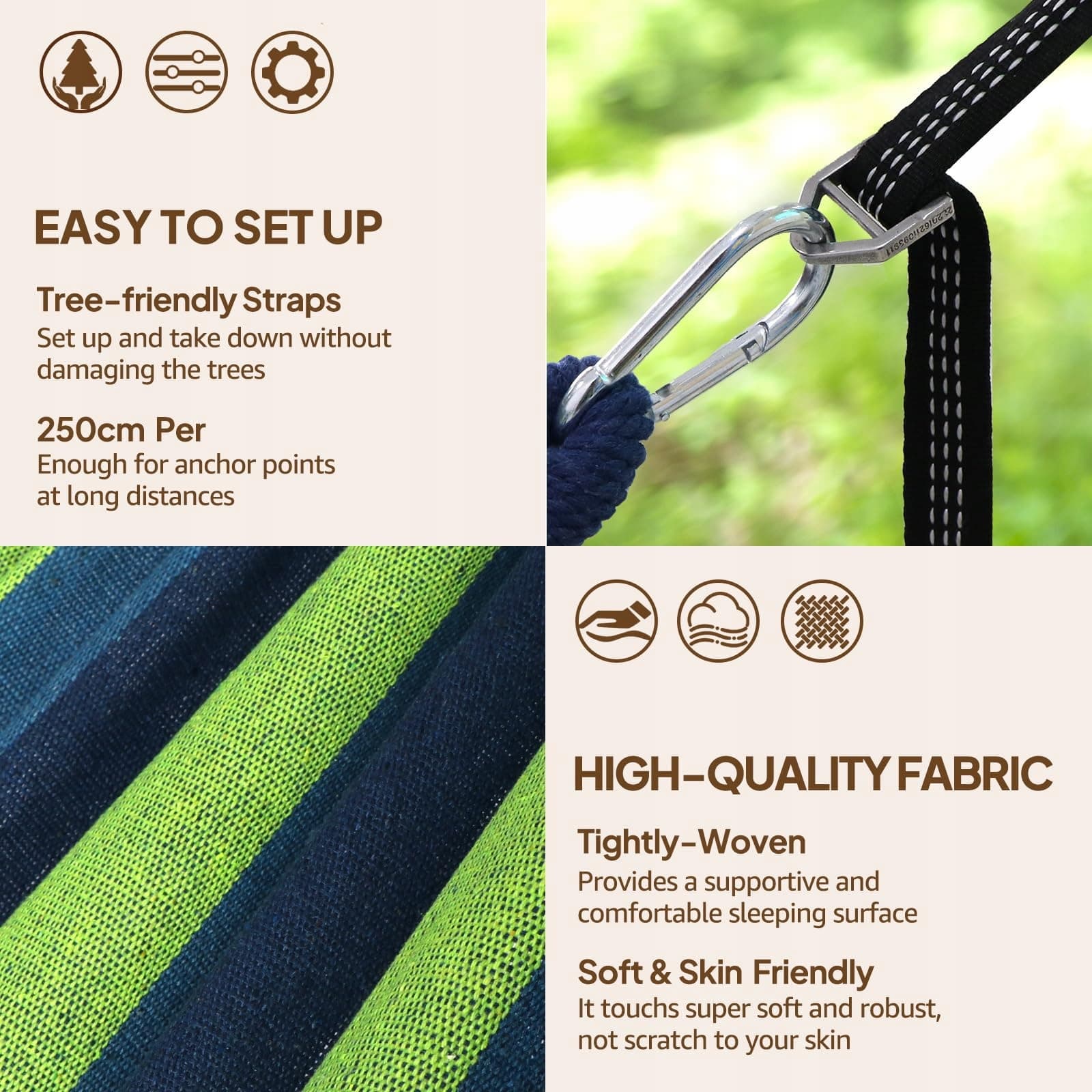 Stabilność i bezpieczeństwo: Drążki rozprężające poprawiają stabilność i zapobiegają nadmiernemu kołysaniu lub przechylaniu, zapewniając bezpieczne i chronione doświadczenie podczas wchodzenia lub wychodzenia z hamaka. Dzięki dołączonym dwóm bezstopniowo regulowanym paskom i dwóm karabińczykom można łatwo i bezpiecznie zamontować hamak, promując bezpieczne i przyjemne leniuchowanie. Karabińczyki zapewniają niezawodne i bezpieczne punkty mocowania.
