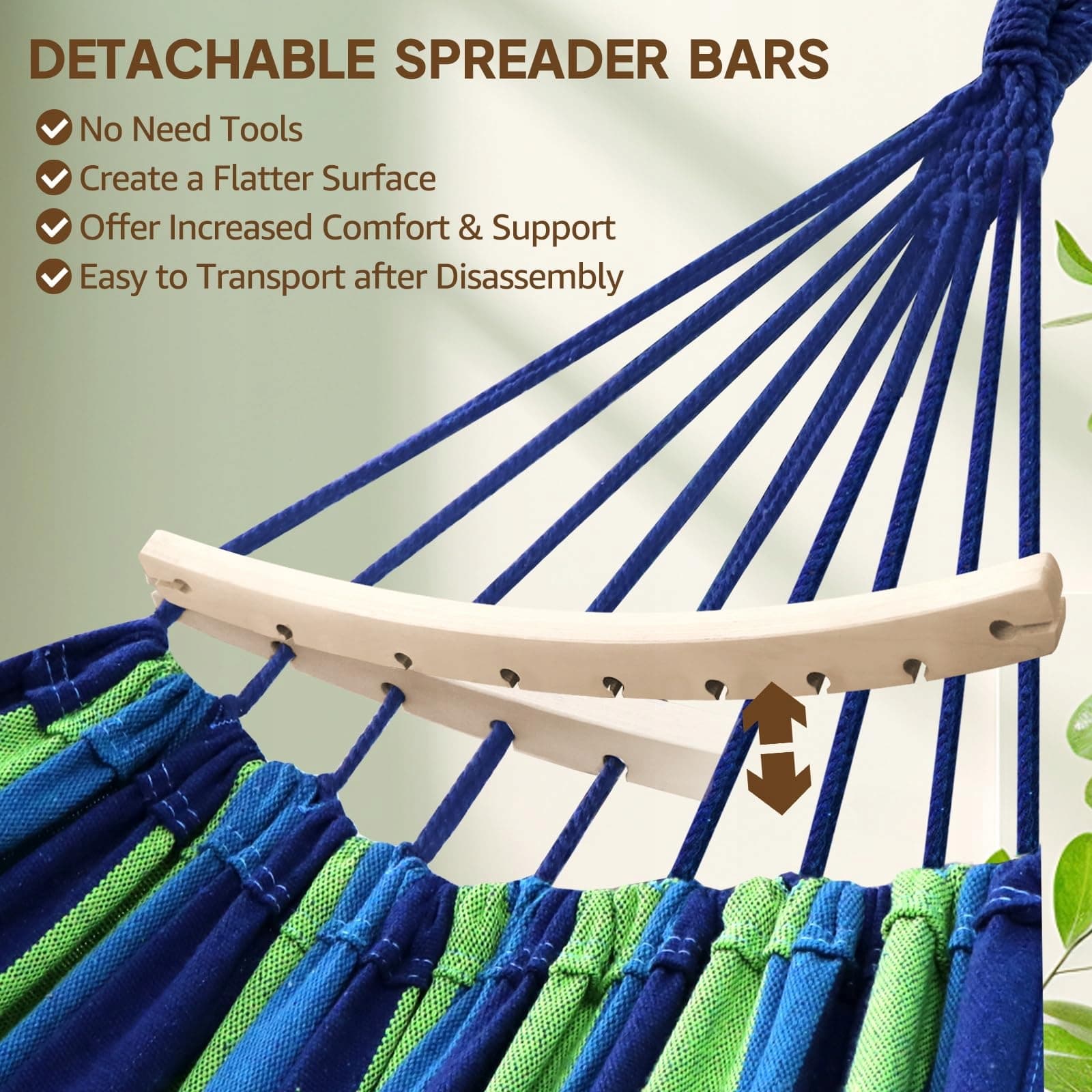Trwałość i łatwość konserwacji: Bawełniane hamaki, które są połączone z dobrze przemyślanym systemem zawieszenia, mogą wytrzymać regularne użytkowanie i działanie czynników zewnętrznych, chociaż niezbędne jest zabranie hamaka do środka podczas złej pogody, aby zachować jego trwałość. Łatwy do czyszczenia materiał bawełniany i zdejmowany drążek sprawiają, że konserwacja jest dziecinnie prosta i zapewniają lata radości przy minimalnym wysiłku.