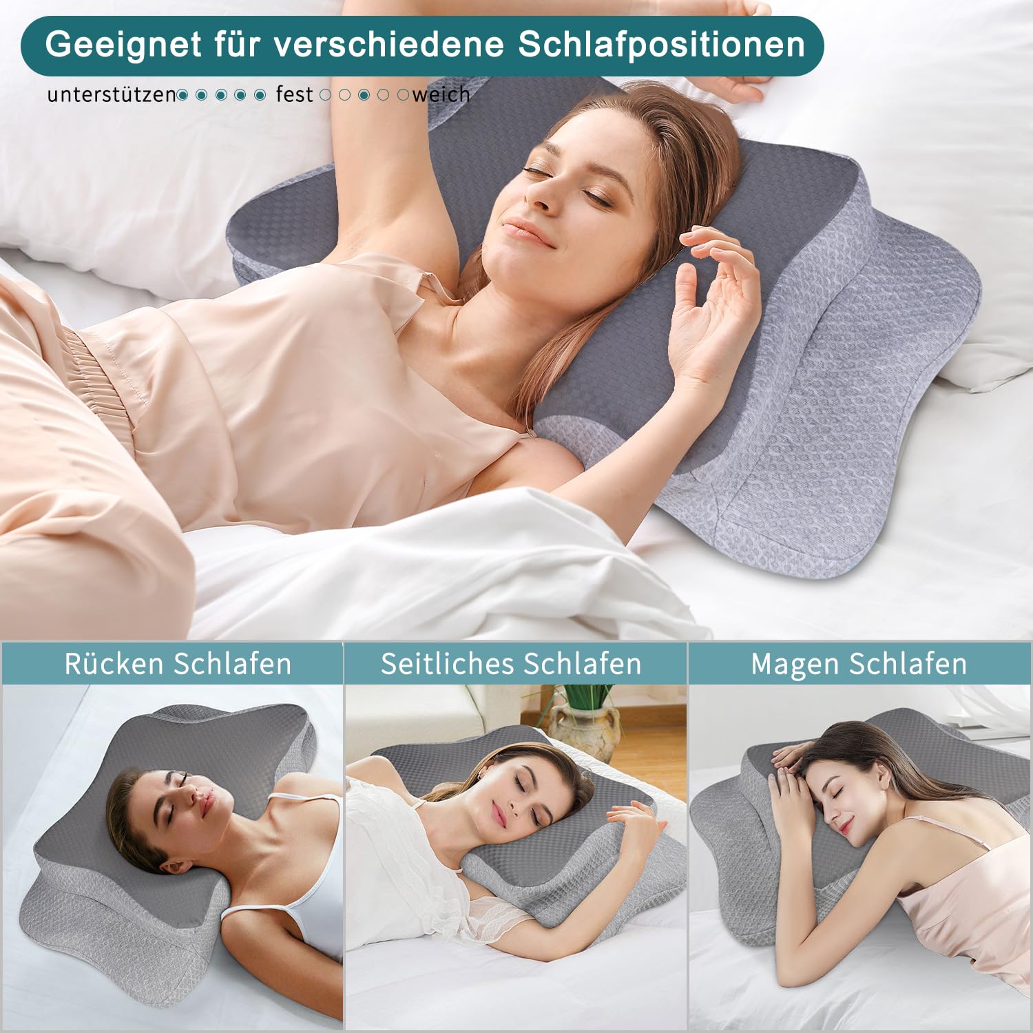 Dopasowuje się do każdej pozycji snu: Ta poduszka szyjna do spania ma 2 różne wysokości konturu, możesz wybrać, która jest dla Ciebie lepsza. Poduszka szyjna z elastycznymi skrzydłami dla osób śpiących na brzuchu zapewnia wygodne wsparcie. Obie strony są nachylone, aby umożliwić naturalne przejście między różnymi pozycjami snu w nocy. Spanie na plecach i na boku dostosowuje się automatycznie, aby osiągnąć głęboki sen.