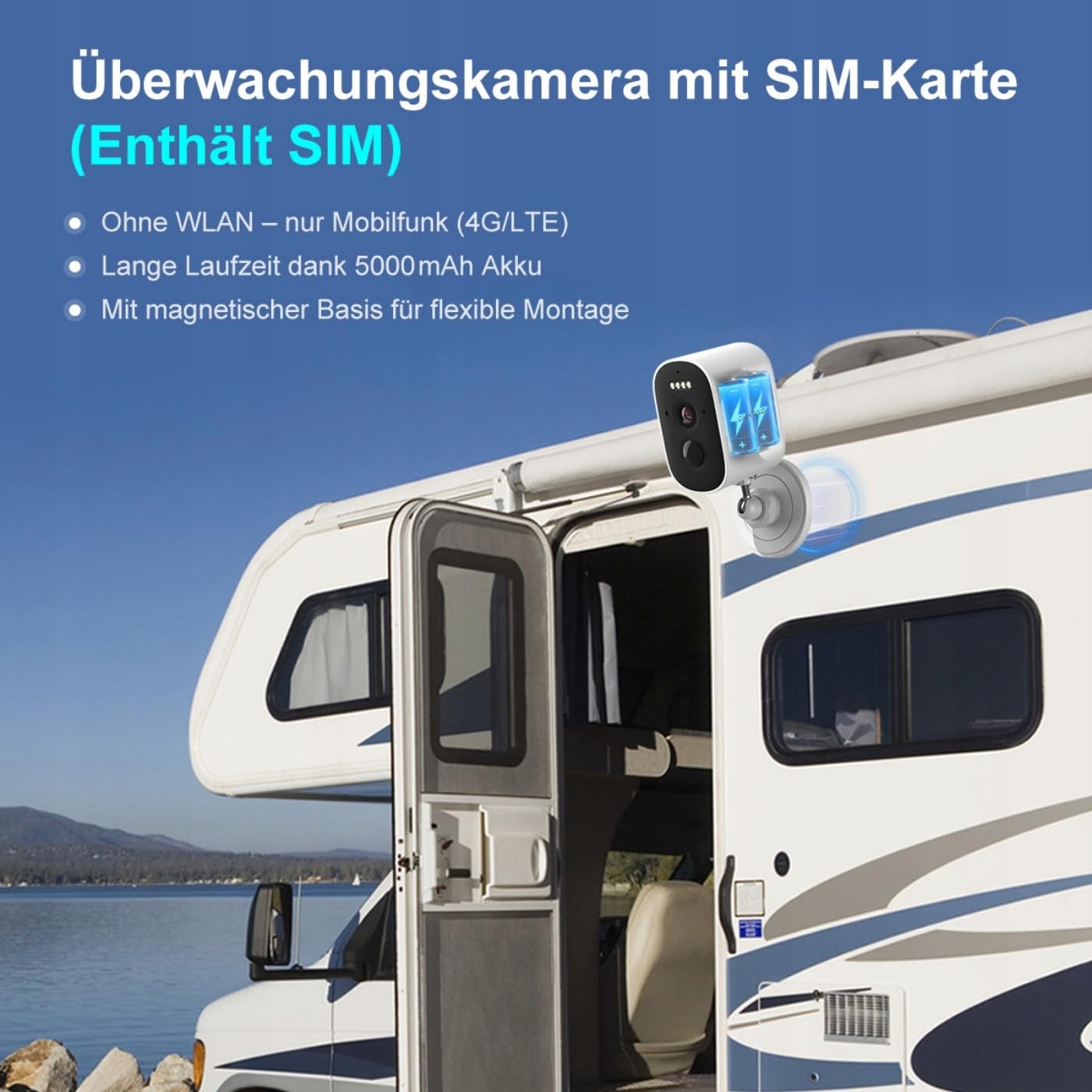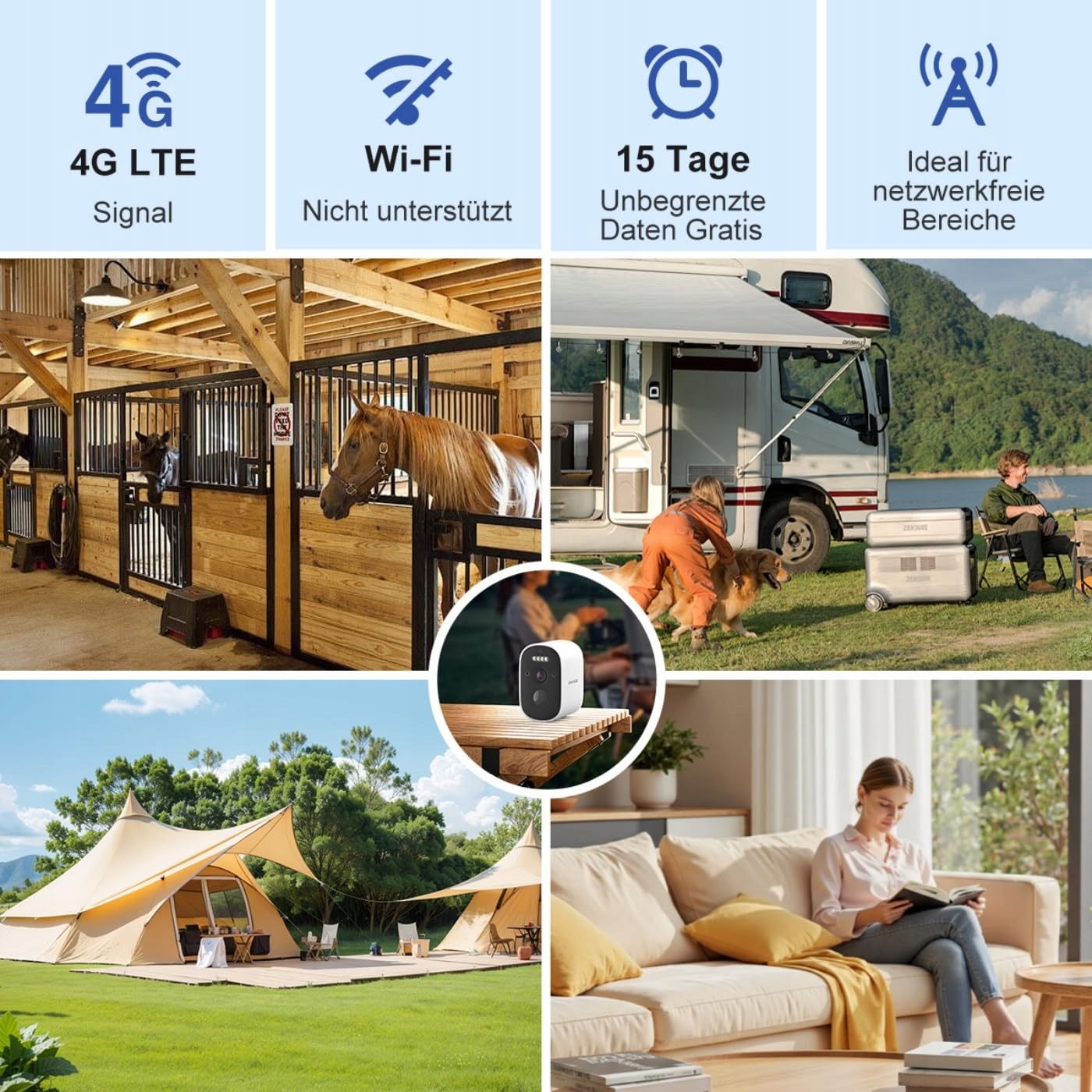 【4G LTE kamera monitorująca bez Wi-Fi】Ta kamera monitorująca z kartą SIM działa niezależnie od Wi-Fi i internetu. Idealna jako kamera zewnętrzna bez Wi-Fi do odległych miejsc, podróży, kempingów, gospodarstw rolnych lub placów budowy.