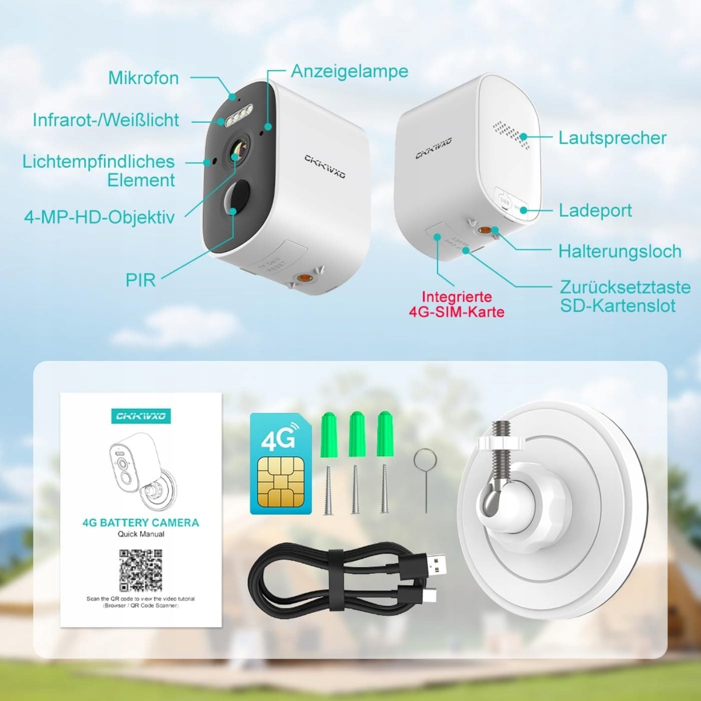 CiKiKWXO 4G Kamera monitorująca z akumulatorem i kartą SIM, kamera 2.5K 5MP bez Wi-Fi, kolorowa nocna wizja, wykrywanie ruchu, dwukierunkowe audio, alarm, IP65, kompatybilna z Alexą do użytku wewnętrznego/zewnętrznego