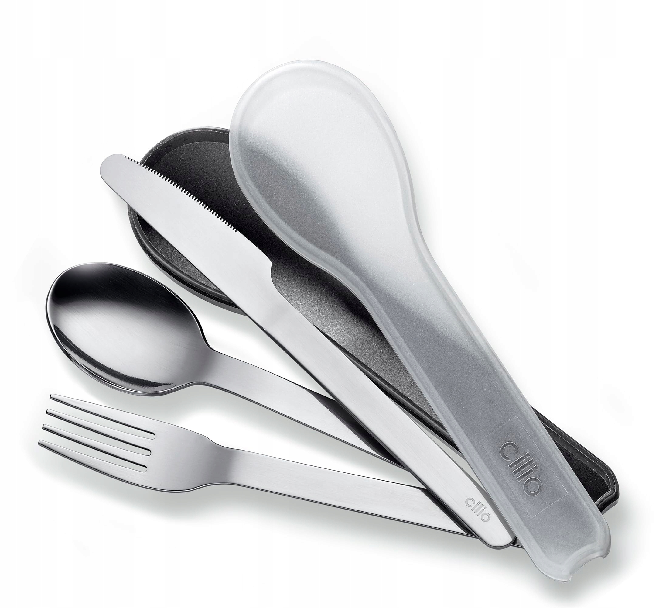 cilio Zestaw sztućców GITA | 3-częściowy | Stal nierdzewna | Sztućce podróżne na wynos | Nadaje się do zmywarki | Nóż, widelec, łyżka | Wielokrotnego użytku sztućce do zabrania ze sobą | Pudełko z tworzywa sztucznego