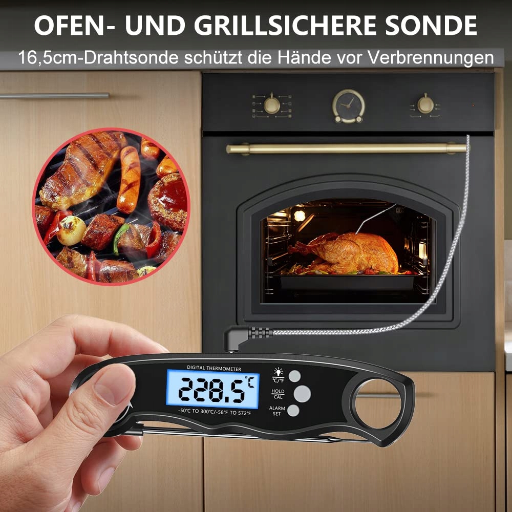 [Natychmiastowy odczyt i wysoka precyzja] Termometr grillowy wyświetla temperaturę w ciągu 2-3 sekund i oferuje wysoką dokładność 1℃/2℉. Posiada szeroki zakres temperatur od -58℉ do 572℉ (-50℃ do 300℃) i łatwo przełącza się między Celsjuszem a Fahrenheitem. Nie musisz już czekać, aż temperatura w gorącej patelni lub na grillu się ustabilizuje. Odczytaj dokładną temperaturę swoich potraw w mgnieniu oka! Idealny do pieczenia indyka, steków, grillowania, mleka itp.