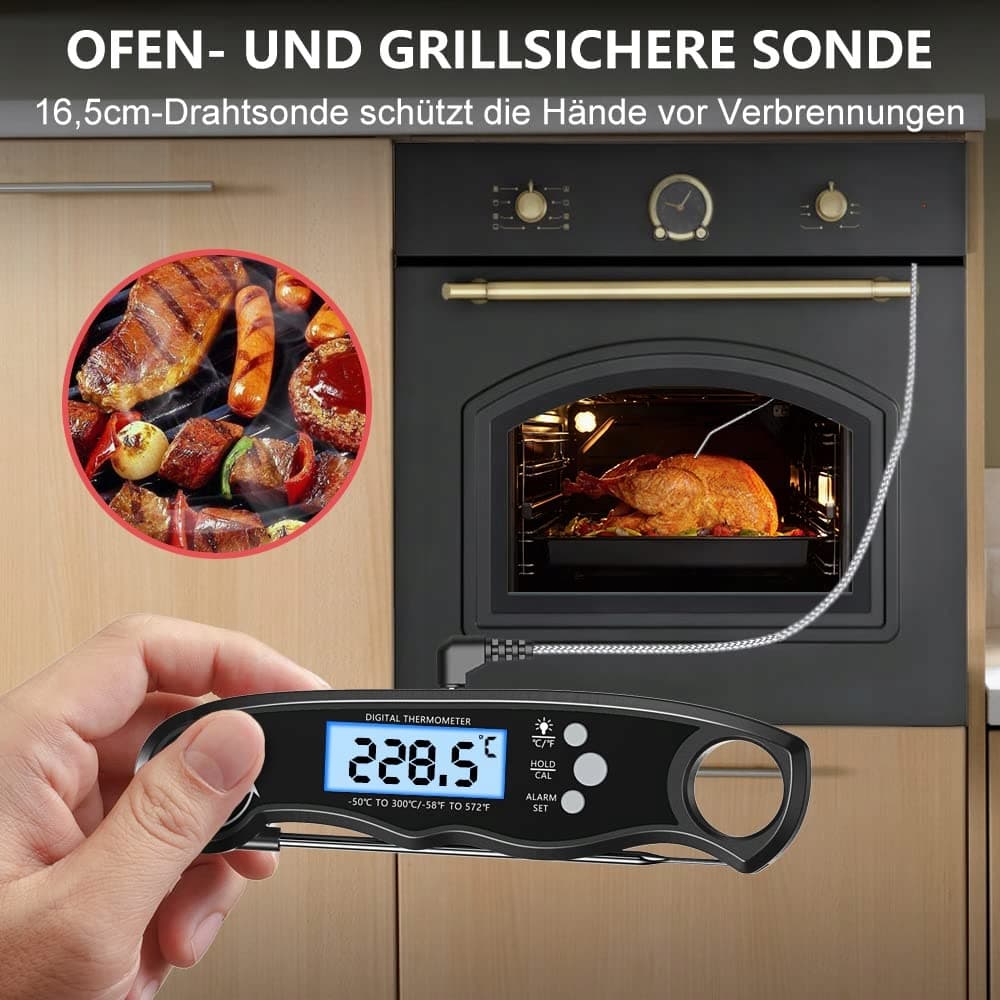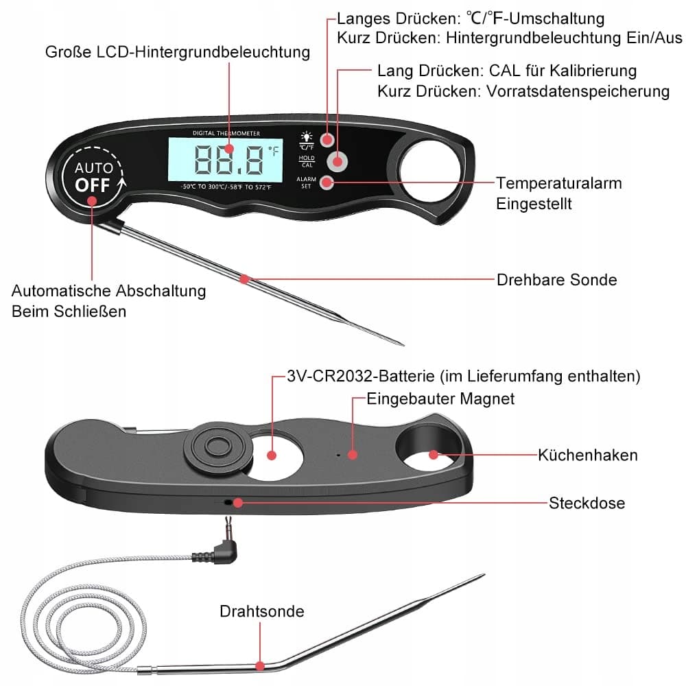 [Przyjazny dla użytkownika] Termometr kuchenny CIRYCASE z składanym czujnikiem oferuje wygodne możliwości przechowywania, ponieważ można go łatwo złożyć. Dzięki wbudowanemu magnesowi i praktycznemu otworowi do zawieszenia można go bez trudu przymocować do piekarnika, lodówki lub innych odpowiednich powierzchni. Z dołączoną wewnętrzną baterią CR2032 termometr jest gotowy do użycia. Dodatkowo zawiera szczegółową tabelę temperatury mięsa, która pomoże Ci w łatwym przygotowywaniu pysznych potraw.