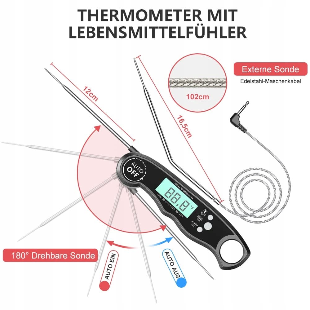 [Wielofunkcyjny termometr do pieczenia] Włożenie obrotowej sondy lub włożenie/wyjęcie sondy przewodowej automatycznie włącza/wyłącza termometr. Duży, jasny, podświetlany wyświetlacz LCD ułatwia odczyt temperatury zarówno w dzień, jak i w nocy. Termometr do pieczenia automatycznie wyłącza się po 10 sekundach bezczynności i posiada funkcję czuwania. Ergonomiczny uchwyt zapewnia wygodny chwyt, aby cieszyć się każdą fazą gotowania!