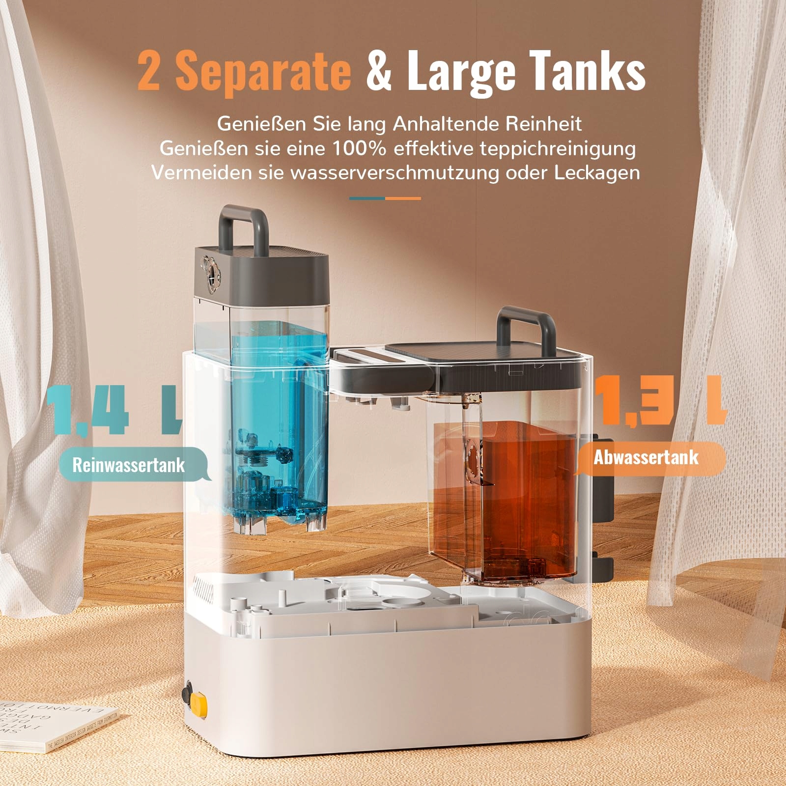 【1,4 & 1,3 Wbudowany Zbiornik na Wodę】 Urządzenie do czyszczenia tapicerki na mokro jest wyposażone w oddzielny zbiornik na wodę z materiału antybakteryjnego, który skutecznie zapobiega powstawaniu zapachów i hamuje wzrost bakterii. Odkurzacz na mokro i sucho z dużą pojemnością zapewnia ciągłe czyszczenie, eliminując problemy z częstym napełnianiem lub opróżnianiem wody. Innowacyjna zintegrowana konstrukcja odkurzacza zapobiega problemom z wyciekami wody