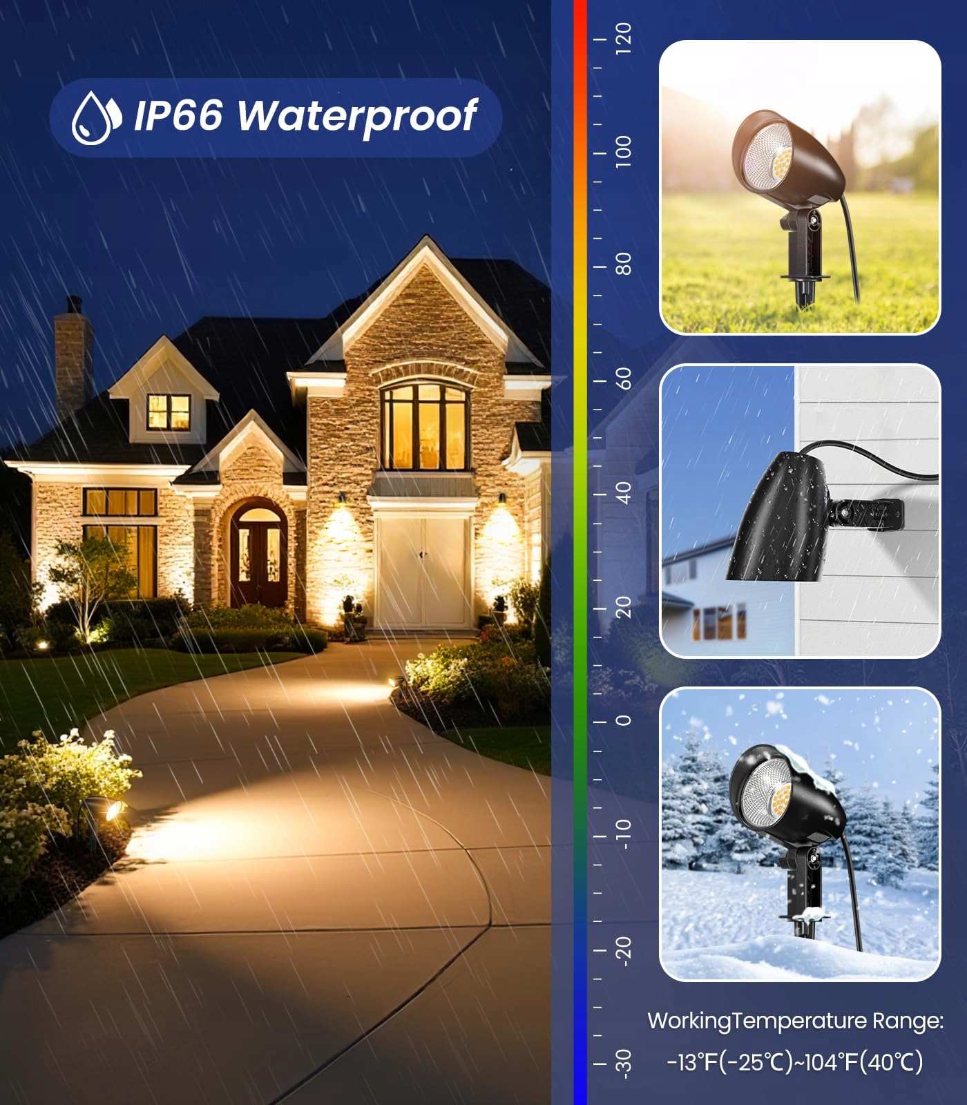 Wodoodporność IP66: CLV 20W lampy ogrodowe są wodoodporne i pyłoszczelne zgodnie z normą IP66, odporne na deszcz, zimno i upał. Nasze lampy ogrodowe na zewnątrz zasilane prądem działają normalnie w temperaturach od -25°C do 55°C i nadają się do użytku wewnętrznego i zewnętrznego do oświetlania ogrodów, drzew, roślin, rzeźb, tarasów, trawników, ścieżek, ogrodzeń itp.
