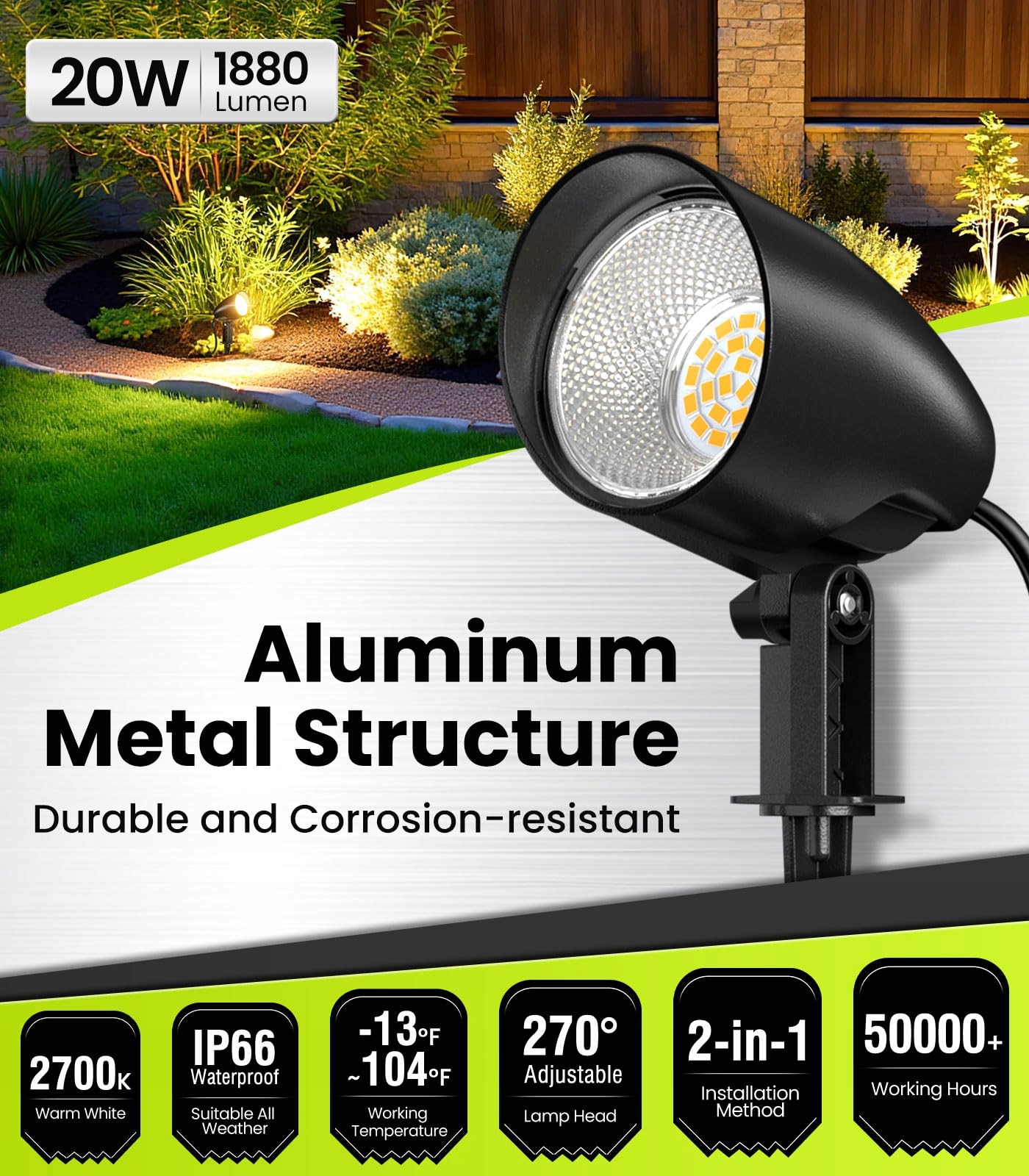 Materiał aluminiowy: Głowica i kolec do ziemi 20W lampy ogrodowej z wtyczką wykonane są z metalu aluminiowego, który oferuje zalety odporności na uderzenia, korozję oraz szybkie odprowadzanie ciepła. Dzięki temu żywotność 20W reflektora LED do ogrodu na zewnątrz znacznie się wydłuża do nawet 50 000 godzin.