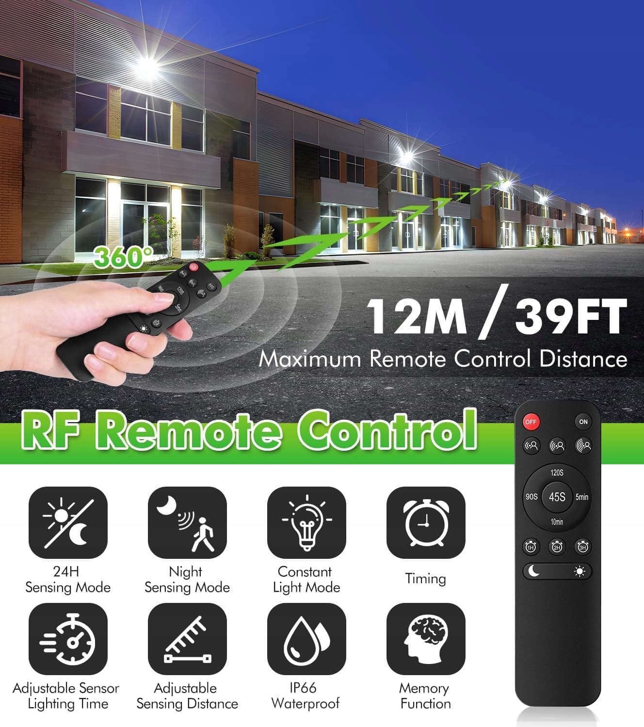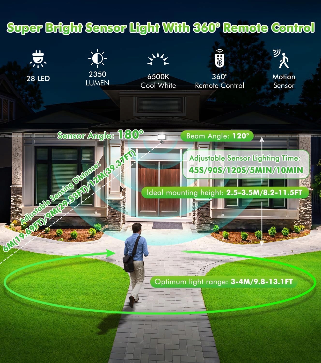 【Super jasny i energooszczędny】25W LED reflektor z czujnikiem ruchu i pilotem do użytku na zewnątrz wykorzystuje 28 wysokiej jakości diod LED o strumieniu świetlnym do 2350LM, zastępuje tradycyjne żarówki 250W, oszczędza ponad 90% energii i może oświetlić obszar około 110 metrów kwadratowych światłem o temperaturze barwowej 6500K zimnej bieli. Kąt świecenia 120° i kąt detekcji 180° zapewniają większy obszar oświetlenia