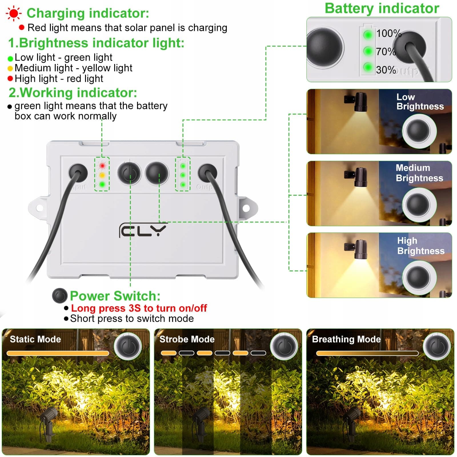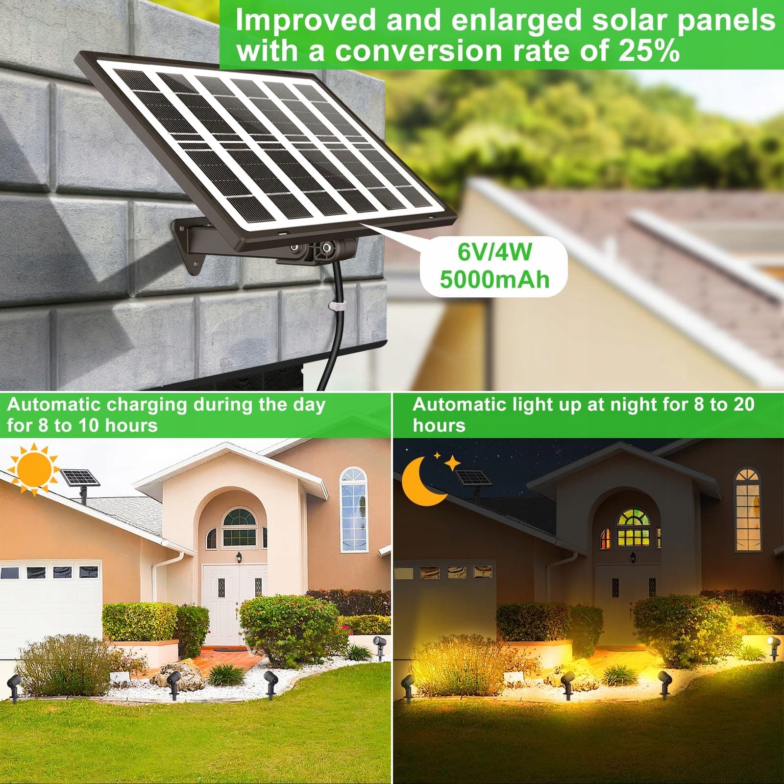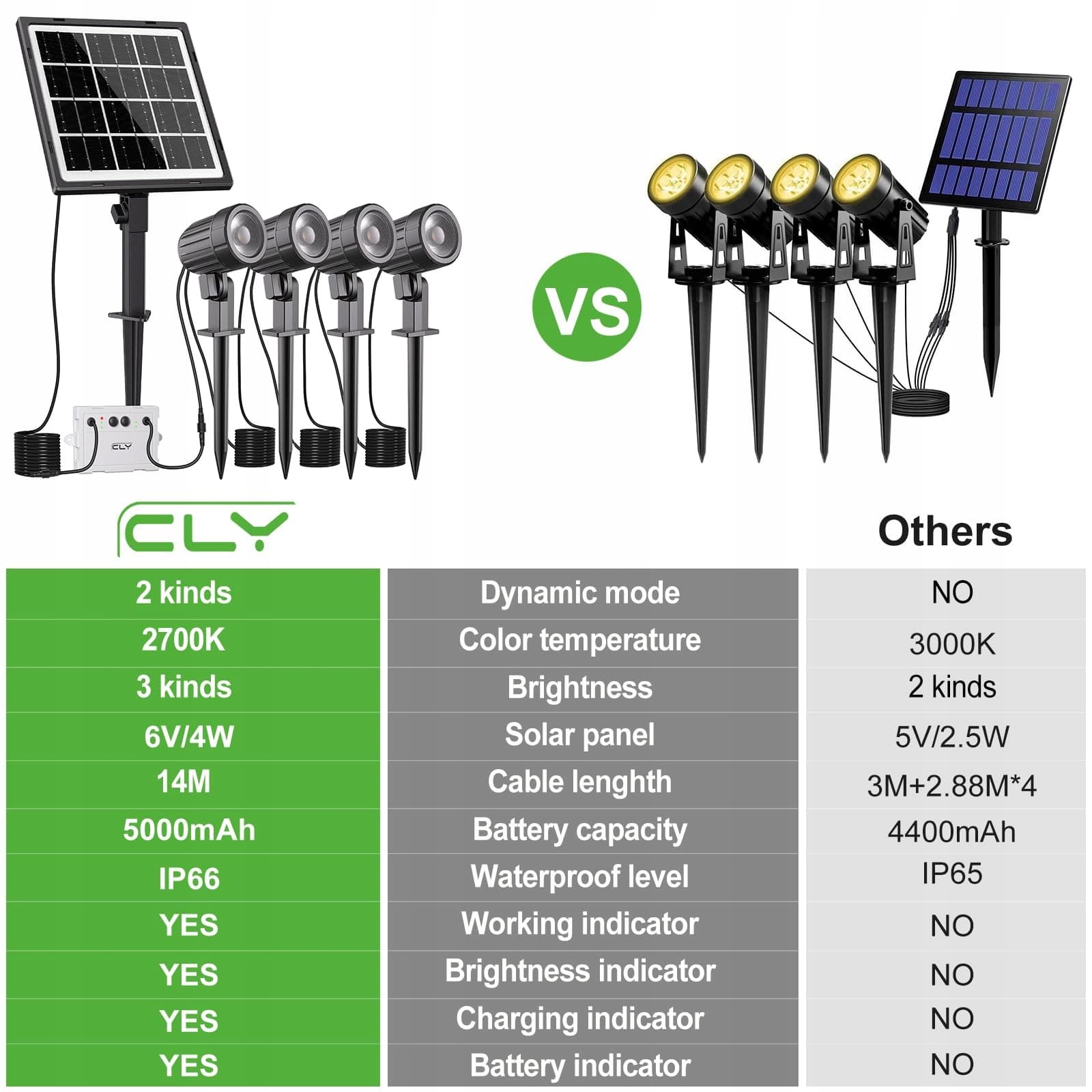 【Wysokowydajny panel solarny】CLY solarna lampa ogrodowa na zewnątrz jest wyposażona w monokrystaliczny panel solarny krzemowy 6V 4W oraz akumulator 5000mAh o współczynniku konwersji energii słonecznej 25%. Moduły solarne regulowane o 360° lepiej pochłaniają światło słoneczne. CLY reflektory solarne ładują się automatycznie w ciągu dnia przez 6–8 godzin i świecą w nocy przez 8–20 godzin. Nie wymaga podłączenia do sieci elektrycznej, brak rachunków za prąd, oszczędność energii i ochrona środowiska.