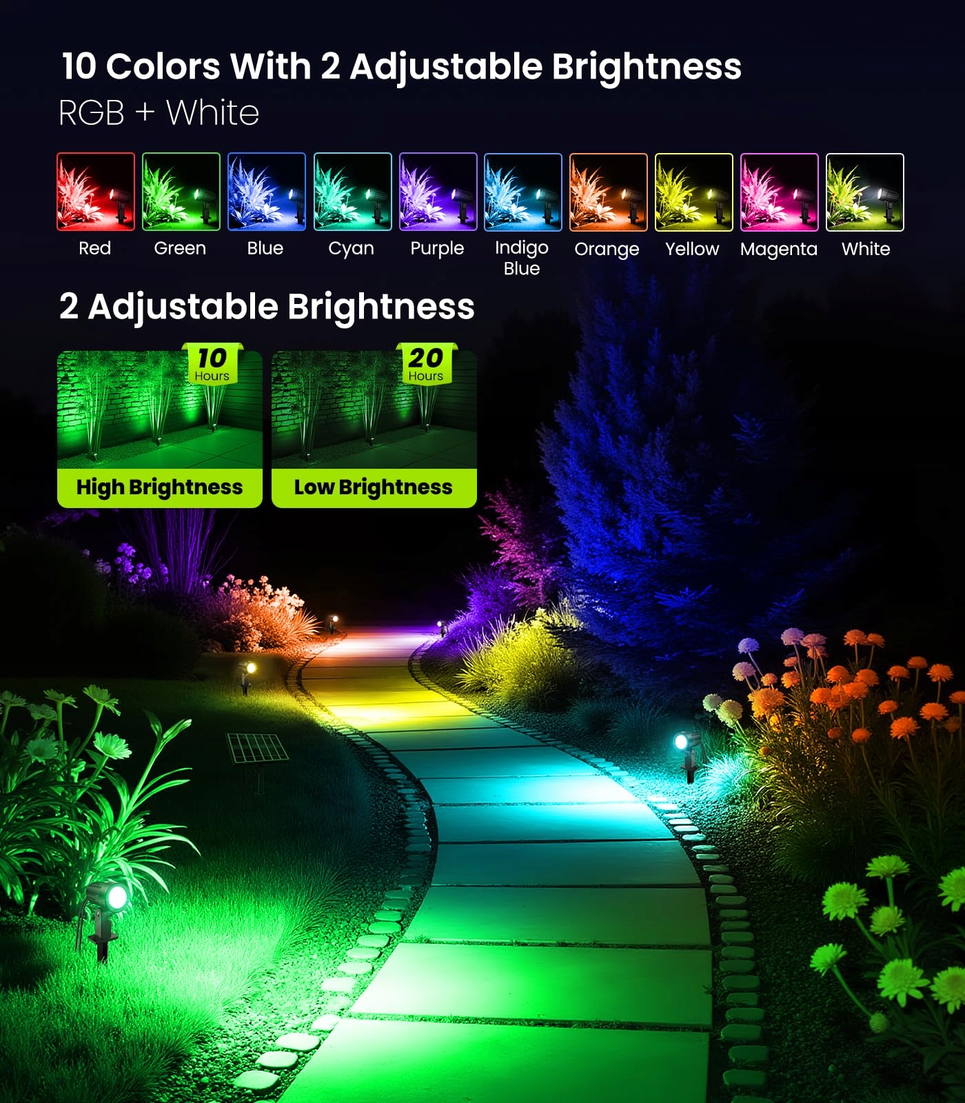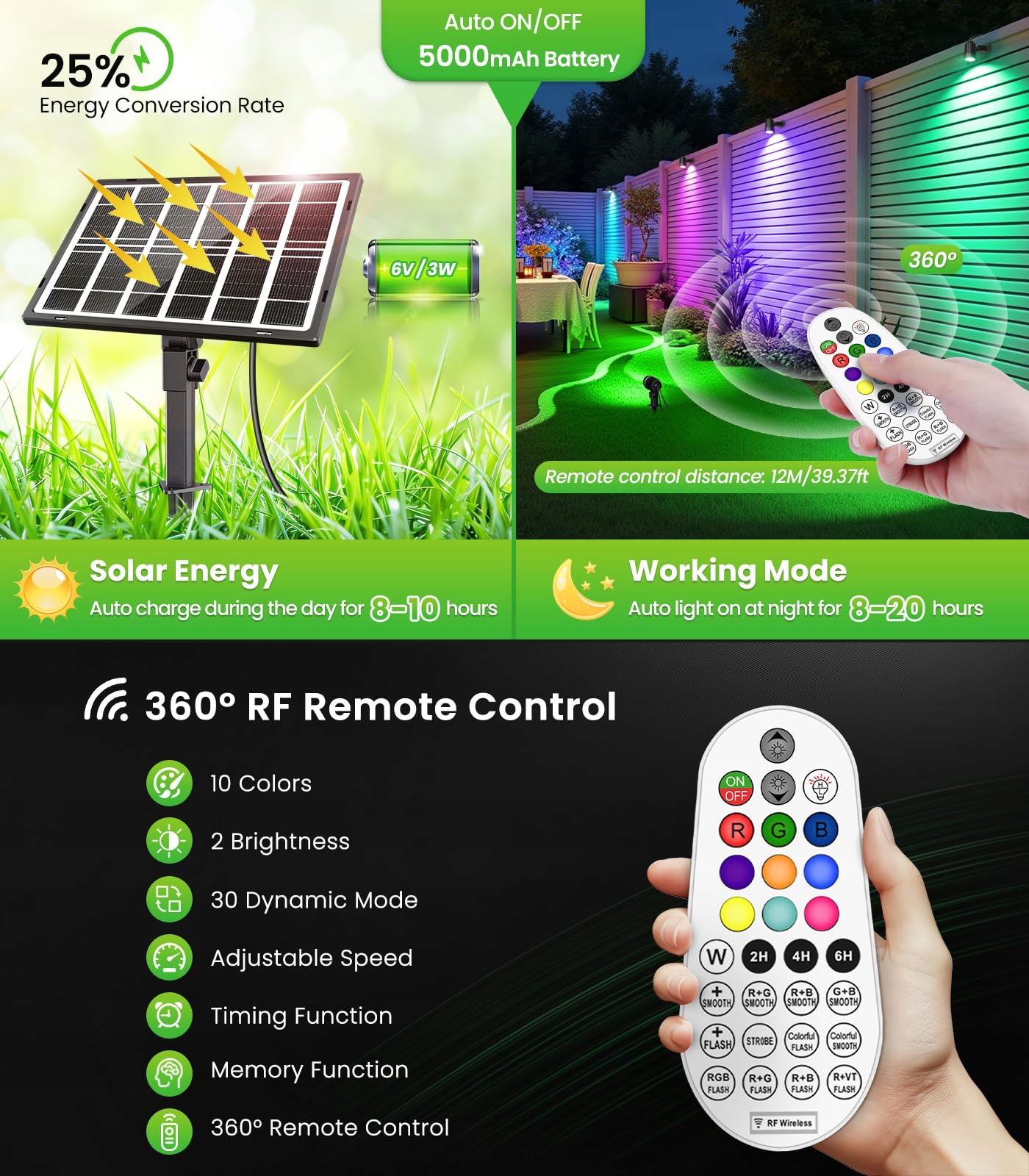 【Ładowalny solarny reflektor RGB】 Solarny reflektor RGB wykorzystuje wysokiej jakości panel solarny i akumulator 5000mAh, współczynnik konwersji wynosi ponad 20%. Zbieraj energię słoneczną w ciągu dnia i włączaj się automatycznie w nocy. Po naładowaniu panelu słonecznego przez 8 godzin dziennie czas pracy może wynosić od 8 do 16 godzin. Brak rachunków za prąd, oszczędność energii i ochrona środowiska.