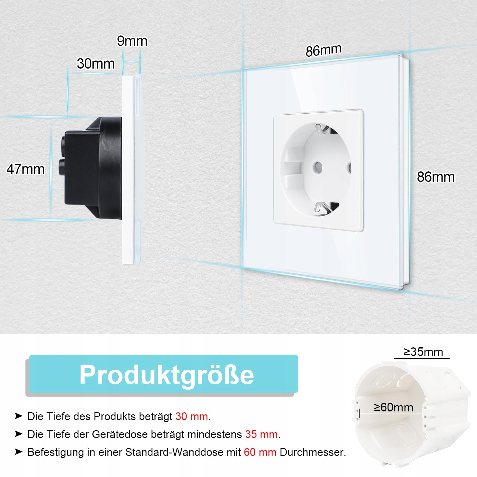 Łatwa instalacja: Głębokość gniazda podtynkowego wynosi 30 mm, montaż w puszce ściennej (głębokość 35 mm lub więcej) za pomocą śrub. Odpowiednie do montażu w pionie i poziomie, zarówno w układzie poziomym, jak i pionowym.