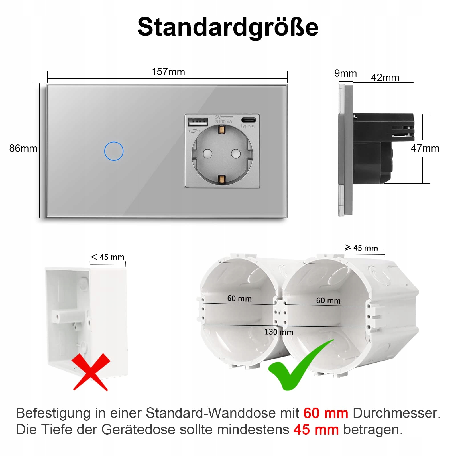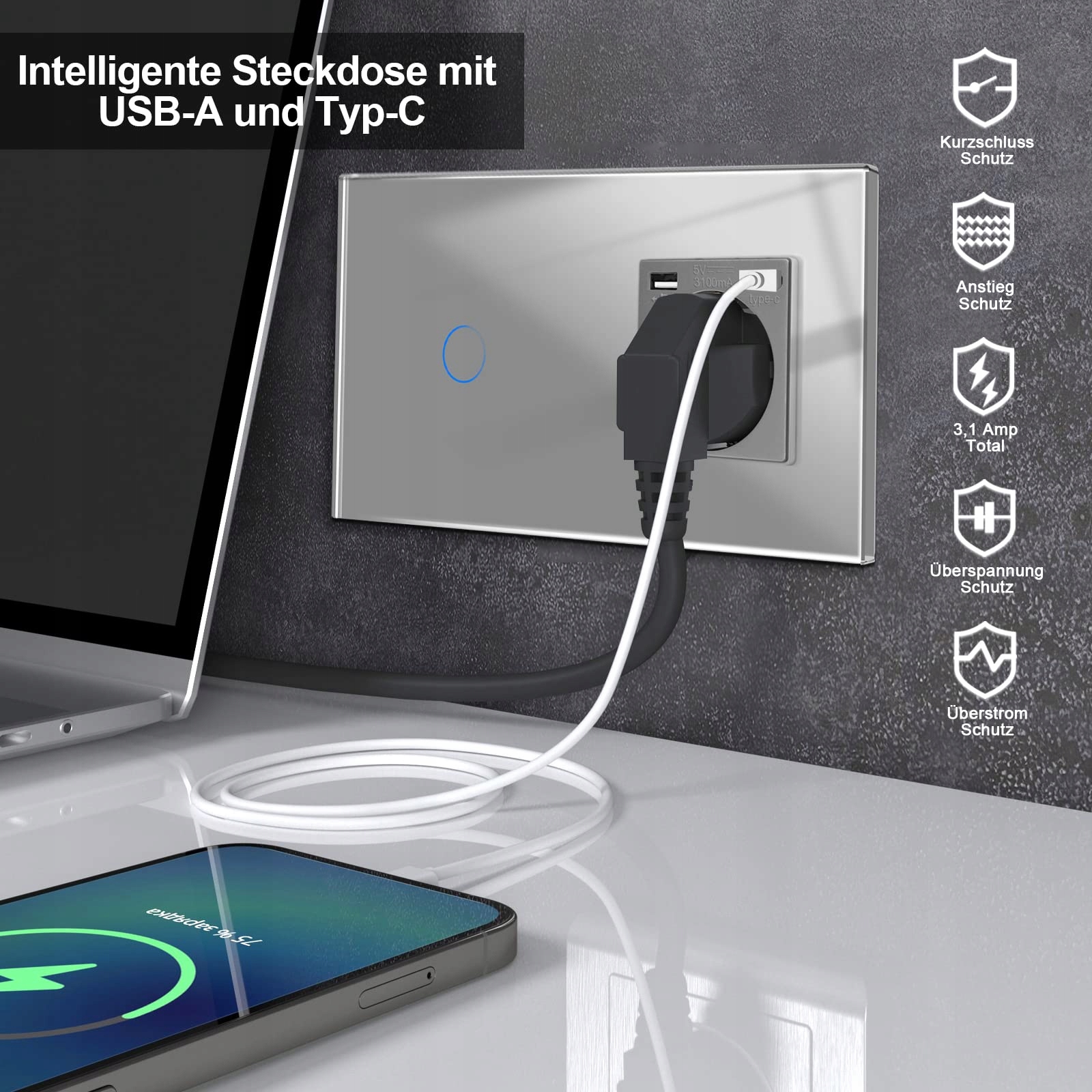 CNBINGO Smart Touch-włącznik światła z gniazdkiem USB Schuko, z portem USB i Typ C (Max. 3.1A), włącznik WLAN dla Alexy, Google Assistant, gniazdko ochronne podtynkowe, Szary