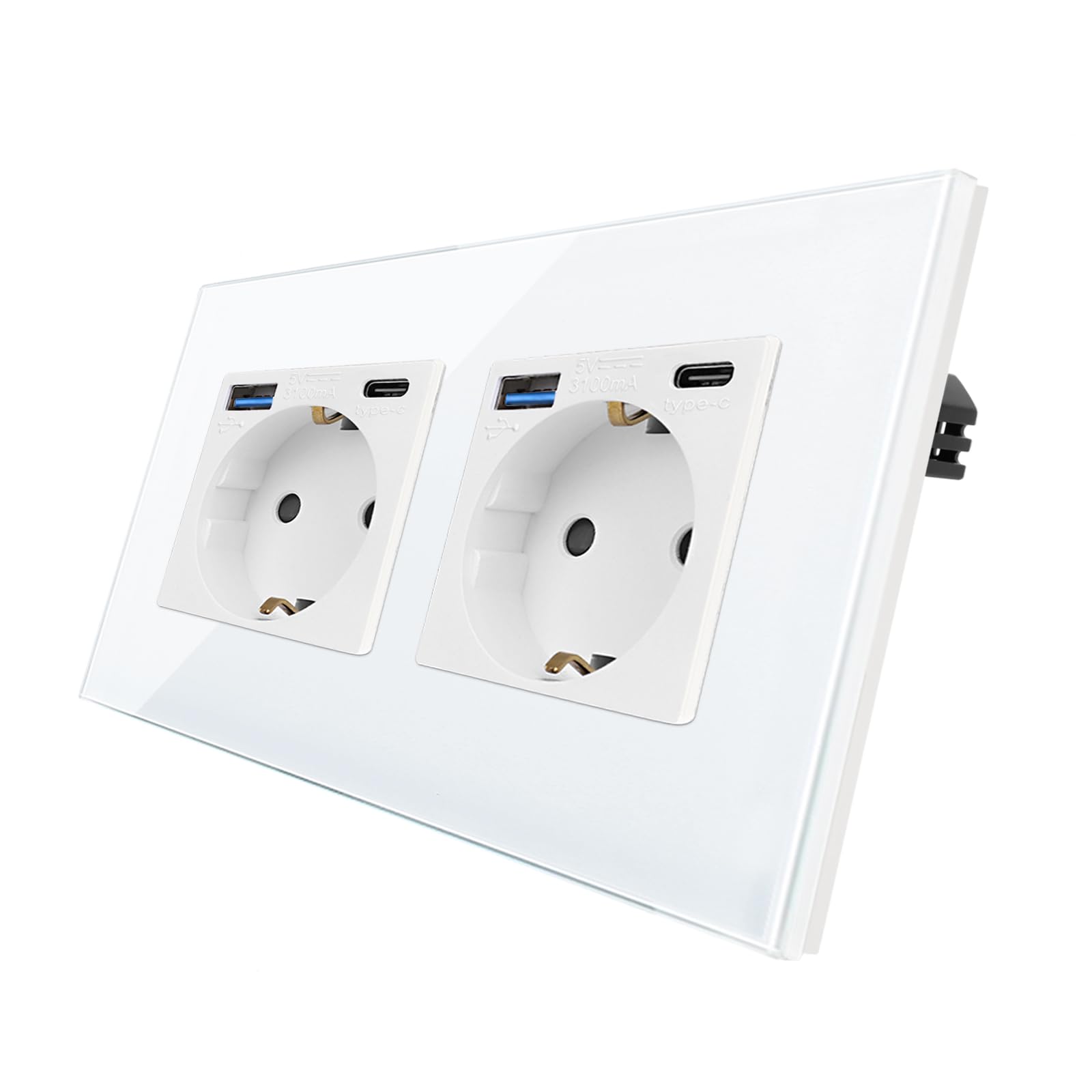 GNBINGO Gniazdo podwójne z szybą z portami USB (wsparcie Typ-C i Typ-A 20W szybkie ładowanie) - Gniazdo podtynkowe w kolorze białym - Gniazdo ścienne Schuko z ramką szklaną