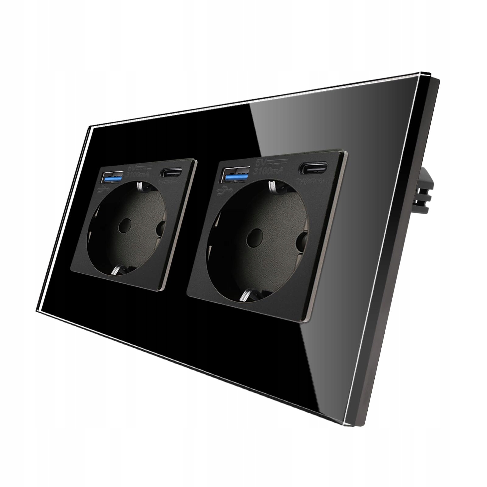 GNBINGO Gniazdo podwójne z szybą z portami USB (wsparcie dla Typ-C i Typ-A 20W Szybkie ładowanie) - Gniazdo podtynkowe w kolorze czarnym - Gniazdo ścienne Schuko z ramką szklaną