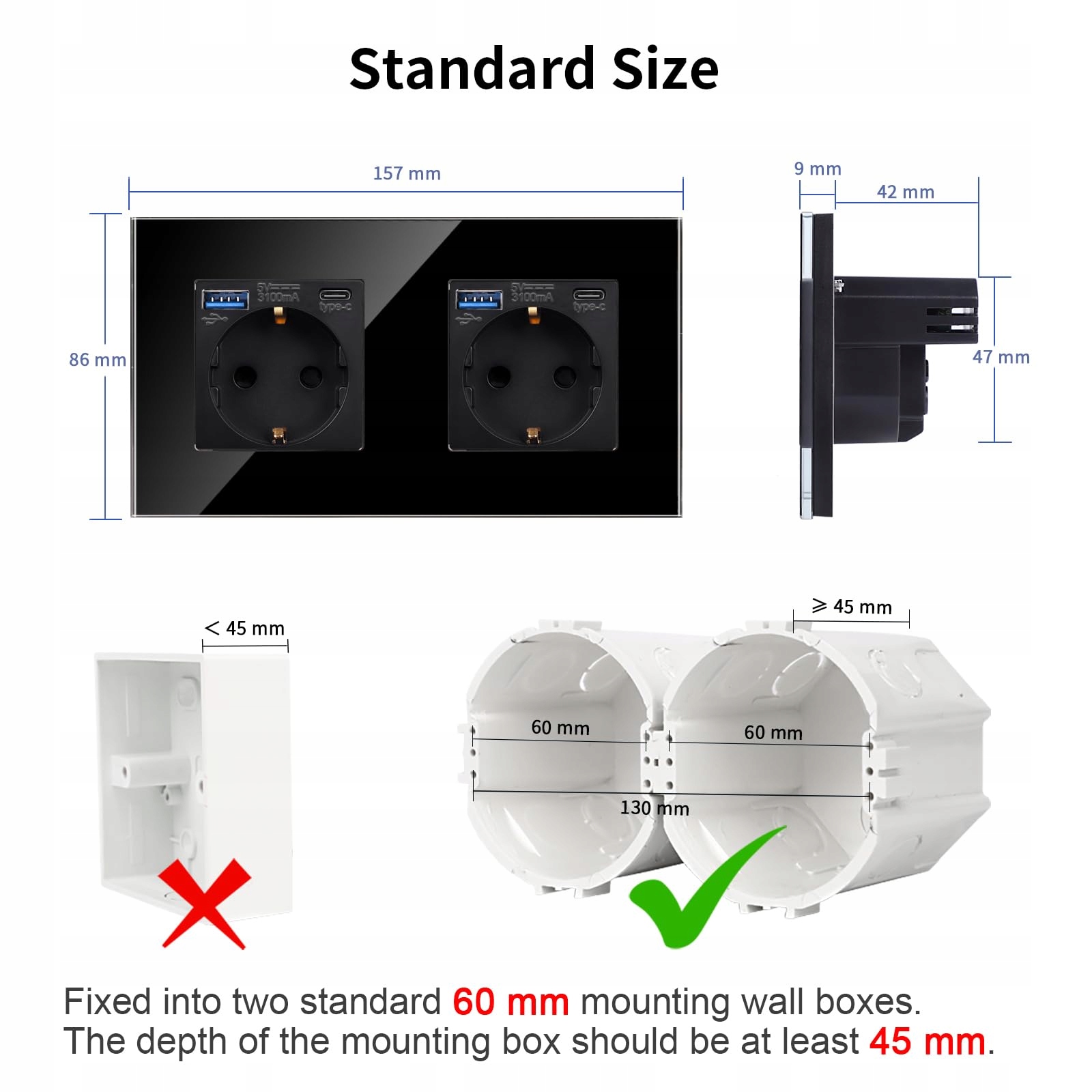 Specyfikacja: 157 mm * 86 mm. Gniazdo z portami USB-A i Typ-C, wsparcie dla 20W Szybkiego ładowania, aby szybko i efektywnie ładować urządzenia mobilne. Gniazdo Schuko obsługuje większość urządzeń domowych, wsparcie AC 16Amp 230V