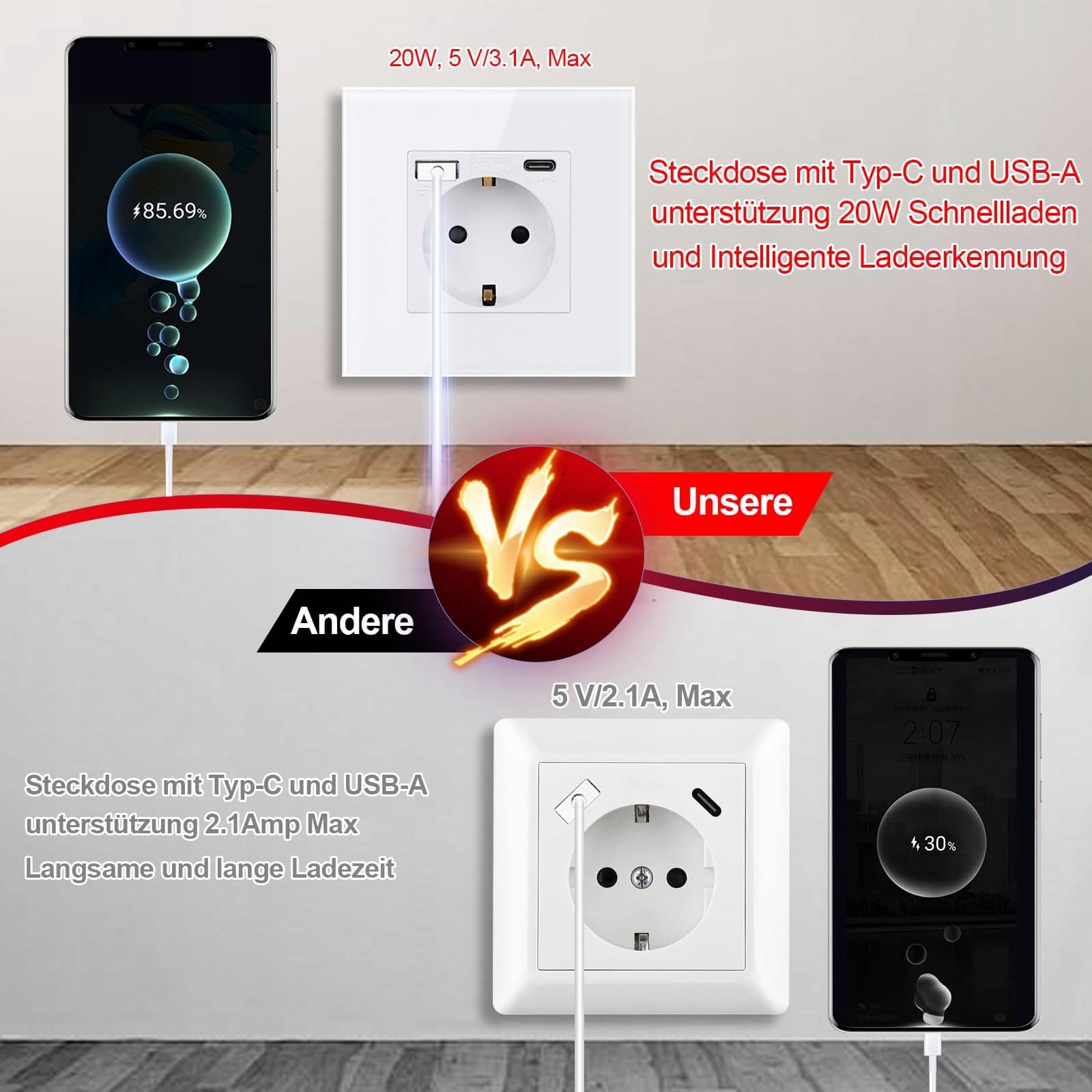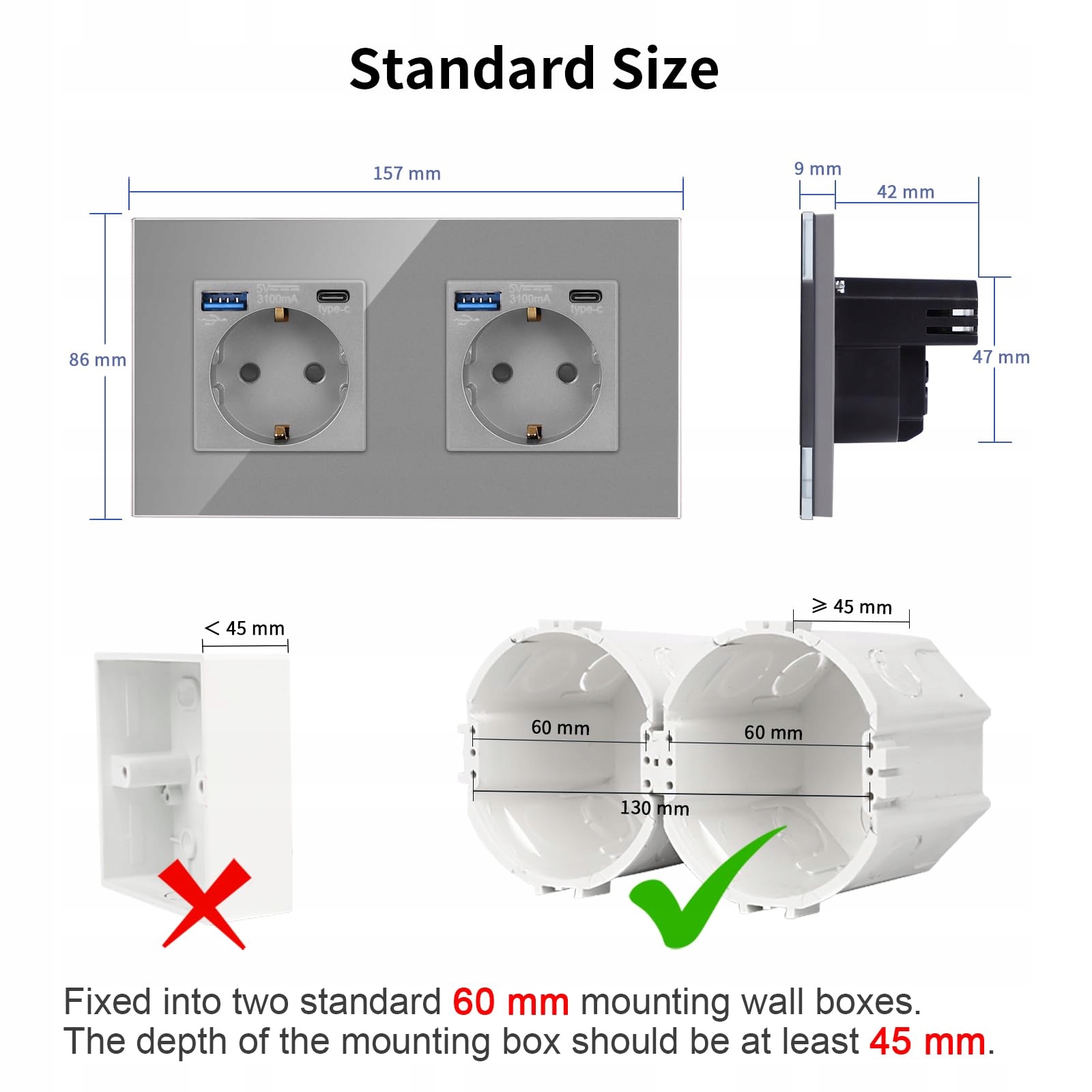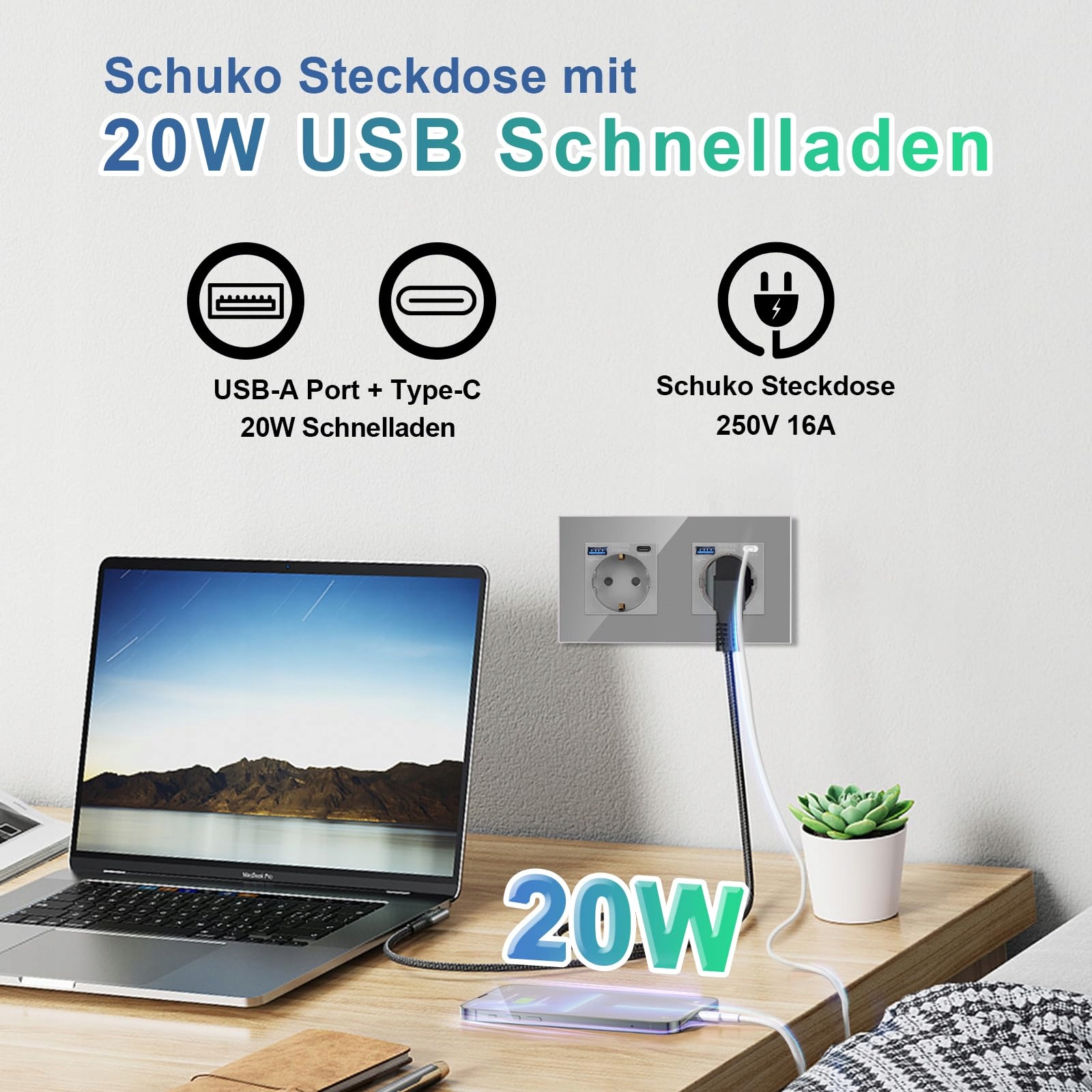 Specyfikacja: 157 mm * 86 mm. Gniazdo z portami USB-A i Typ-C, wsparcie dla 20W szybkiego ładowania, aby szybko i efektywnie ładować urządzenia mobilne. Gniazdo Schuko obsługuje większość urządzeń domowych, wsparcie AC 16Amp 230V