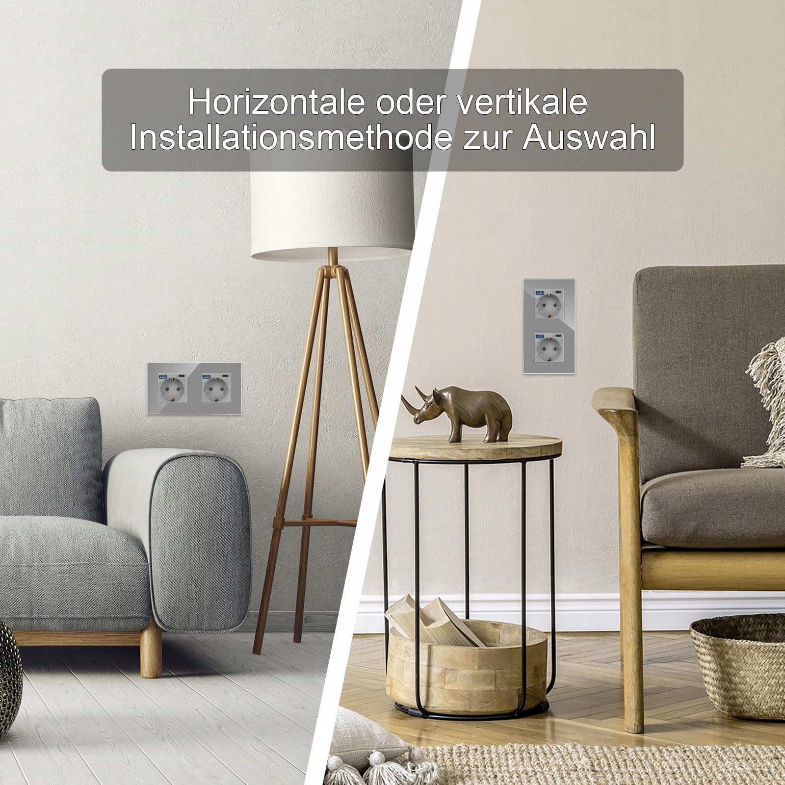 GNBINGO Gniazdo podwójne ze szkła z portami USB (wsparcie dla Typ-C i Typ-A 20W szybkiego ładowania) - Gniazdo podtynkowe w kolorze szarym - Gniazdo ścienne Schuko z ramką szklaną