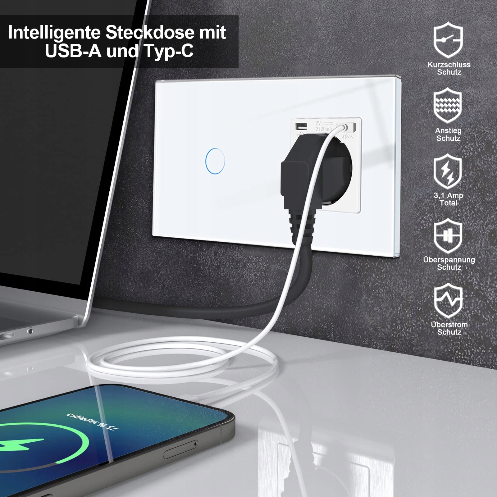 Gniazdko USB: Nie smart. Gniazdko z Typ-C i Typ-A. Podwójne USB o łącznej maks. 3,1 Ampera do szybkiego i efektywnego ładowania urządzeń mobilnych. Gniazdko Schuko obsługuje maks. 250 V, może działać z większością urządzeń domowych.