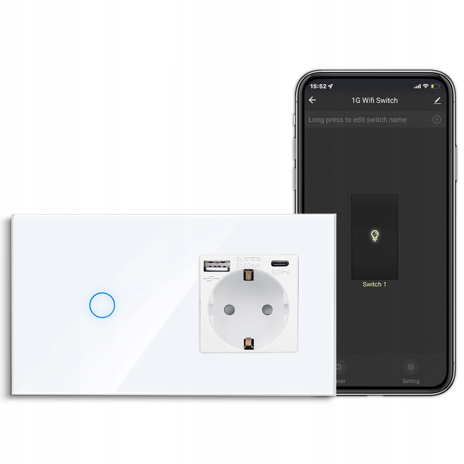 Skład: Smart Touch-włącznik światła (wymagana jest żyła neutralna) i gniazdko Schuko (nie smart) z portem Typ-C i portem Typ-A (Max. 3.1A).