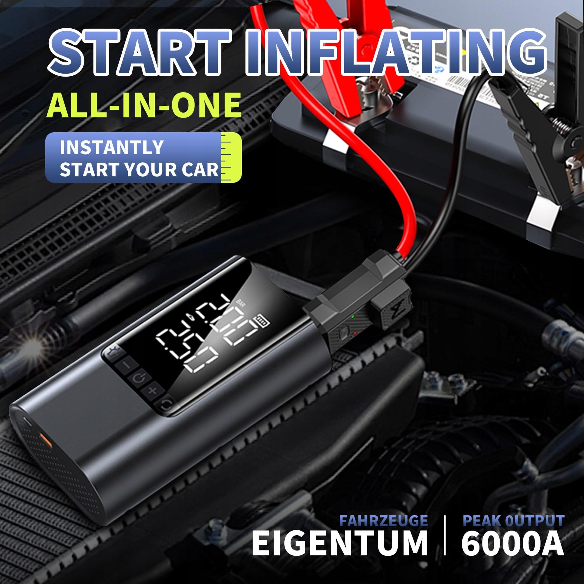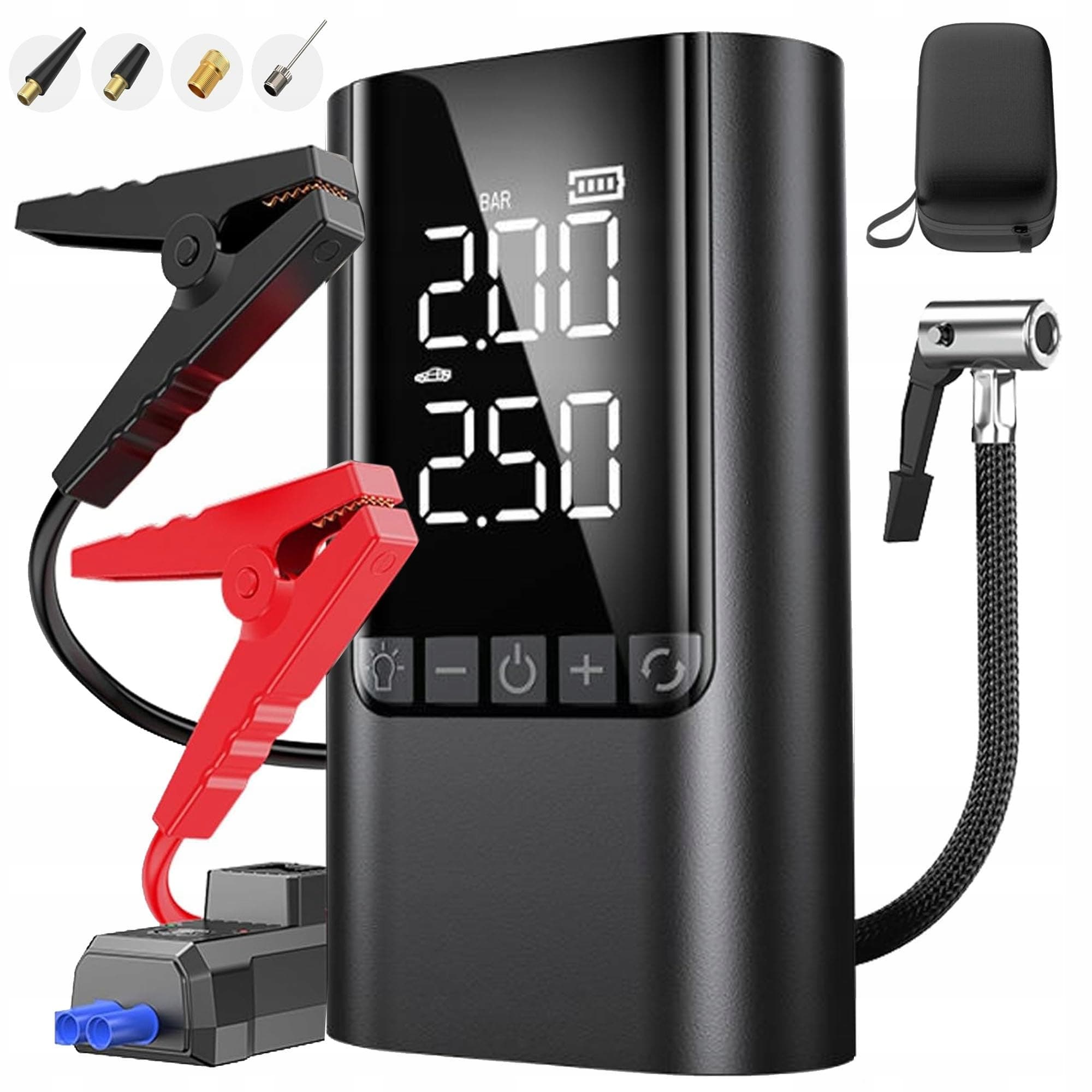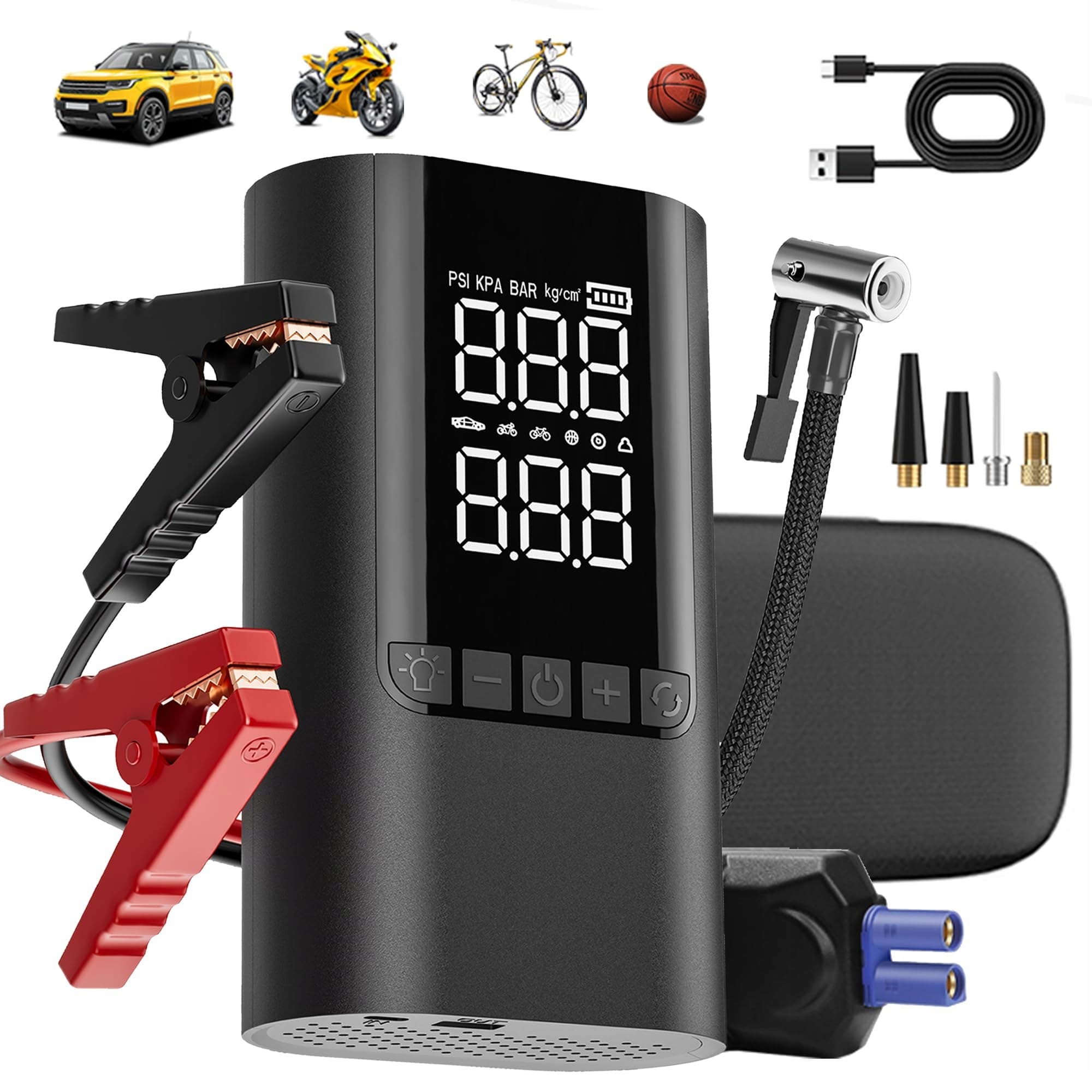 Precyzyjny kompresor 150 PSI: Ten powerbank do rozruchu z kompresorem oferuje pięć trybów pompowania, trzy jednostki ciśnienia i automatyczne wyłączanie dla wygodnego napełniania; zawiera cztery różne końcówki do elastycznego pompowania opon, piłek i artykułów rekreacyjnych przy stabilnym ciśnieniu