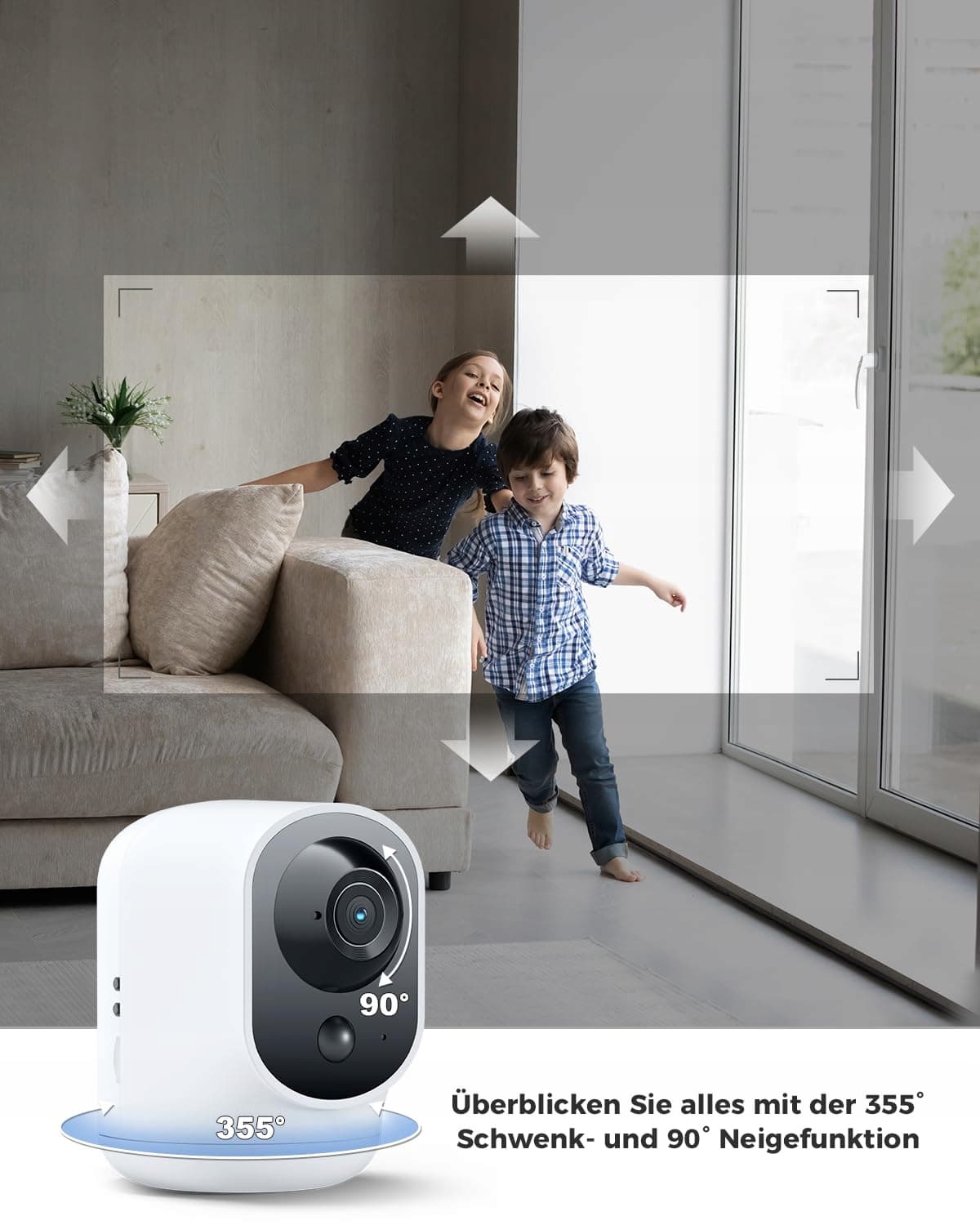 Długotrwała bateria & obrót i pochylenie: Ta kamera bezpieczeństwa do wnętrz jest wyposażona w akumulator o pojemności 5200mAh, który zapewnia długotrwałą wydajność. Po pełnym naładowaniu może wykryć ruch do 5000 razy, zapewniając ciągły monitoring. Dzięki poziomemu zakresowi obrotu 355° i pionowemu zakresowi pochylenia 90° ta kamera wewnętrzna oferuje kompleksowe pokrycie, umożliwiając łatwe monitorowanie każdego kąta pomieszczenia.