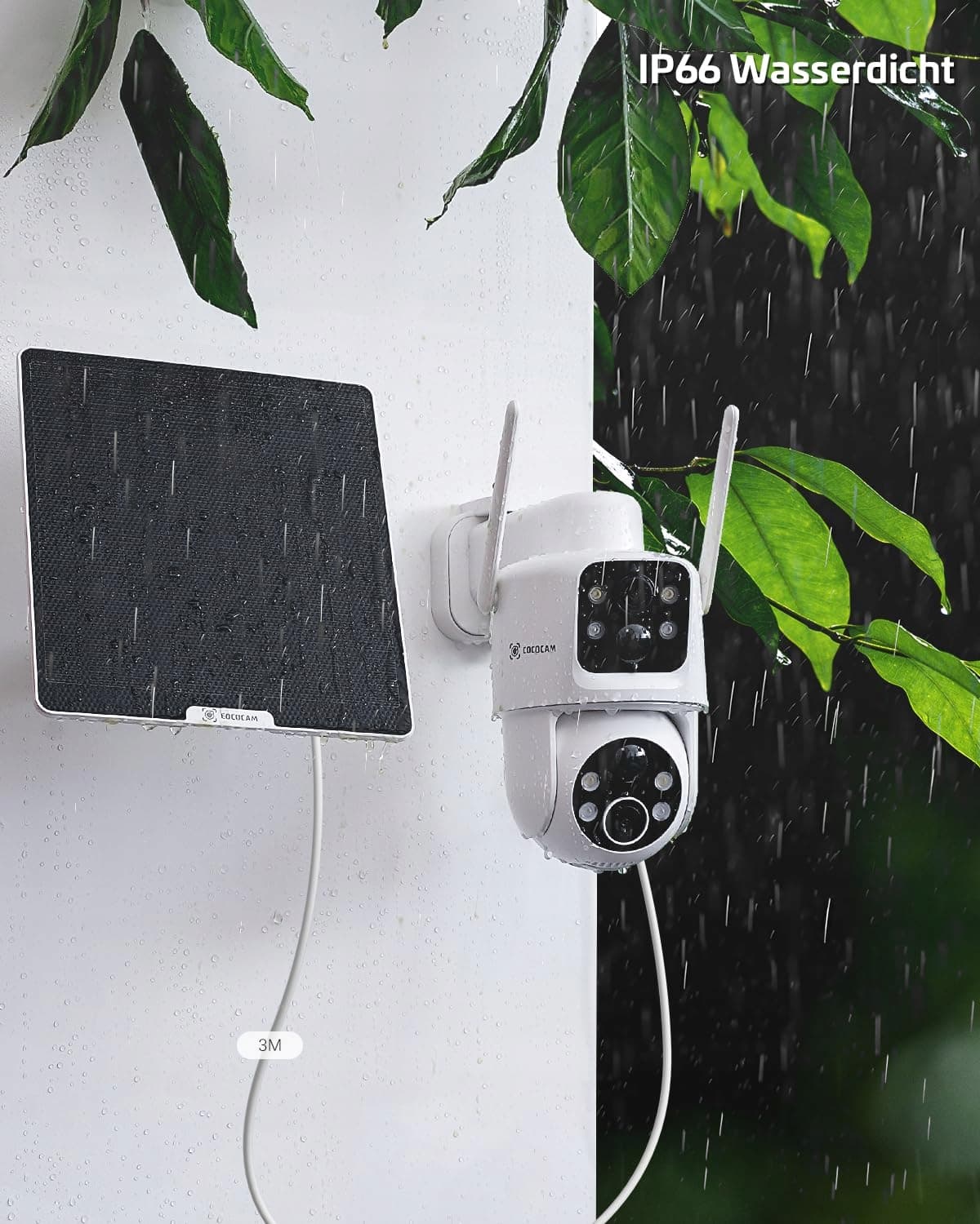 COCOCAM 2K Kamera monitoringu zewnętrznego na baterię WLAN z podwójnym obiektywem, kamera solarna na zewnątrz, podwójny PIR, bateria 10000mAh, 355°P 90°T, analiza AI, panel słoneczny 6W, kolorowe widzenie nocne