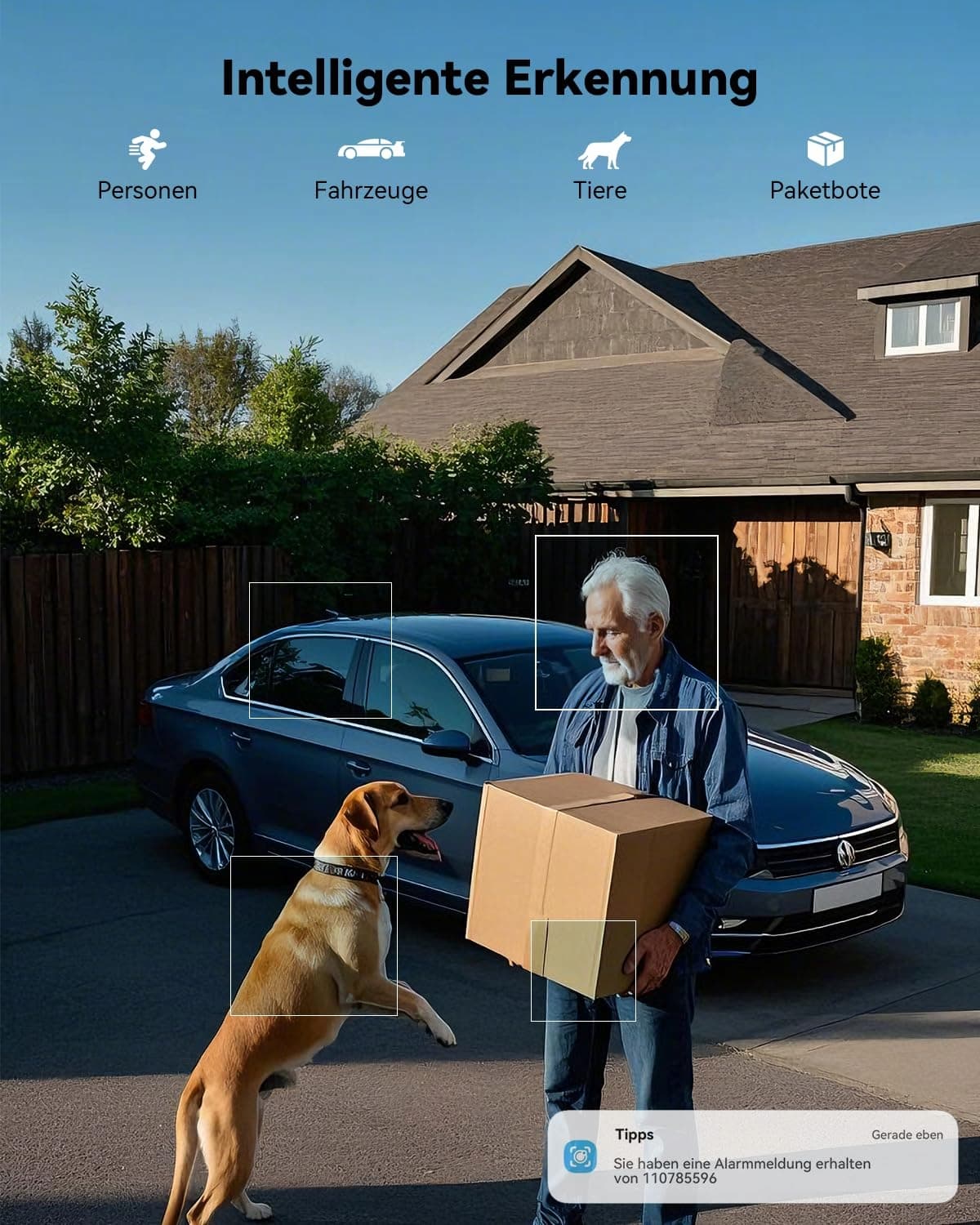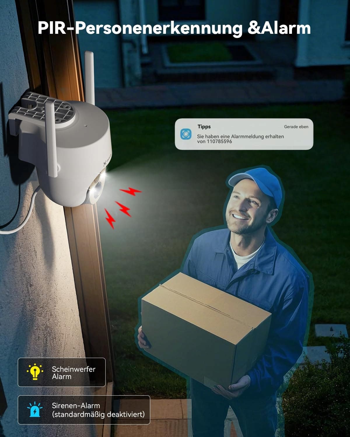 Zaawansowane wykrywanie AI & inteligentne powiadomienia: Ta solarna kamera do monitoringu z wykrywaniem wspieranym przez AI potrafi rozróżniać ludzi, pojazdy i zwierzęta domowe oraz współpracuje z Alexą i Google. Posiada również inteligentne alarmy świetlne i dźwiękowe (domyślnie wyłączone), uruchamiane ruchem, a także wykrywanie osób PIR do 13 metrów oraz oferuje indywidualnie konfigurowalne strefy alarmowe dla większego bezpieczeństwa.