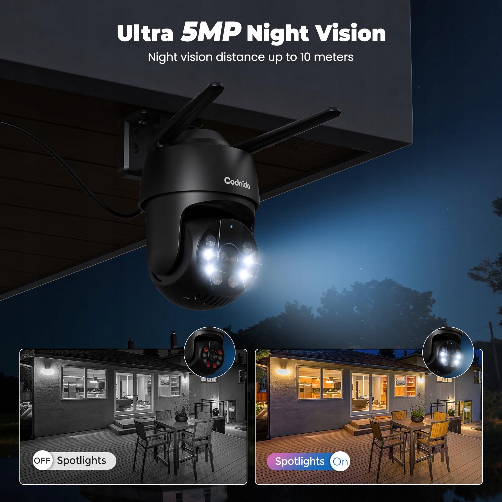 Codnida 5MP Kamera do monitoringu zewnętrznego WLAN,2,4/5Ghz WiFi Kamera zewnętrzna z czujnikiem ruchu,Automatyczne śledzenie,24/7 nagrywanie,Kolorowy tryb nocny,IP66, 2-kierunkowe audio,Czarny(wsparcie Alexa)