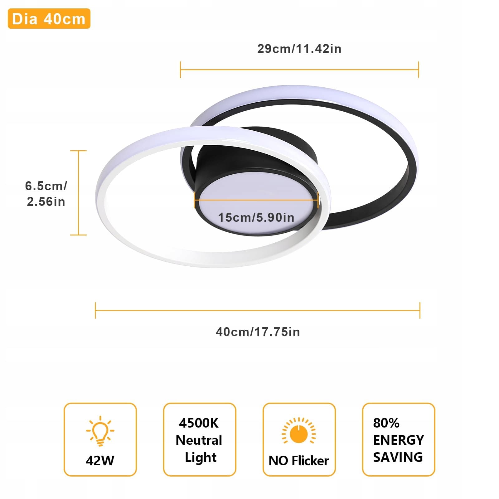 【Rozmiar produktu】42W lampa sufitowa LED (źródło światła LED nie jest wymienne). Naturalne światło 4500K, kolor obudowy: czarny, AC220V, wymiary: L40*W28.5*H6cm (15,75*11,22*2,36 cala), średnica 40cm