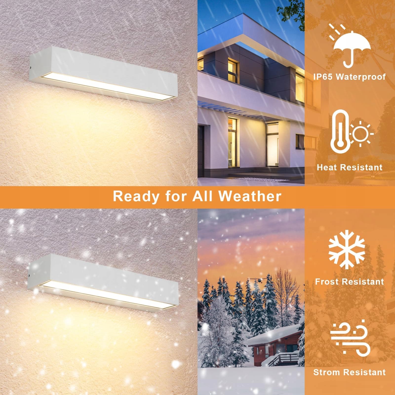 Wodoodporna lampa ścienna IP65: Lampa LED na zewnątrz z funkcją wodoodporności IP65, nawet przy wszelkiego rodzaju złej pogodzie (takiej jak: ulewny deszcz, silny śnieg, grad), nasza lampa ścienna na zewnątrz nadal działa normalnie. Zabezpieczenie przed zwarciem i przeciążeniem zapewnia bezpieczne i niezawodne użytkowanie
